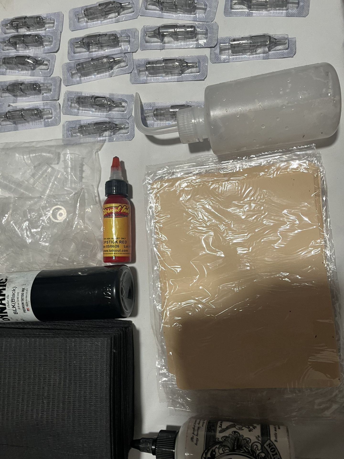 Includes: 5 fake skins, ink caps (many), dynamic black tattoo ink, red external ink,16 tattoo cartridge needles, squeeze wash bottle, tattoo stencil solution, 45+ dental bibs. Let me know for offers all this stuff is used but everything is still more then half way used including the ink and stencil solution I also have a tattoo machine wireless let me know for offers on that too. PICK UP ONLY‼️
