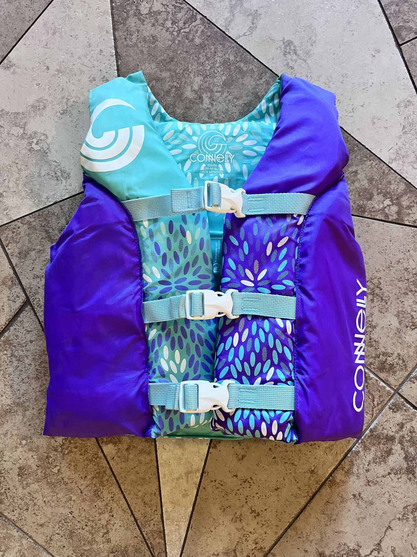 Barely used. Perfect condition This is a Connelly Youth Nylon Life Jacket, specifically designed for girls. • Product: Connelly Girl's Youth Retro Nylon Life Jacket. o • Features: U.S. Coast Guard Approved Type III PFD, durable nylon construction, adjustable fit with three quick-release buckles, and a bright retro design. o • Sizing: Tailored for youth girls weighing between 55-88 lbs with a chest size of 24"-29".