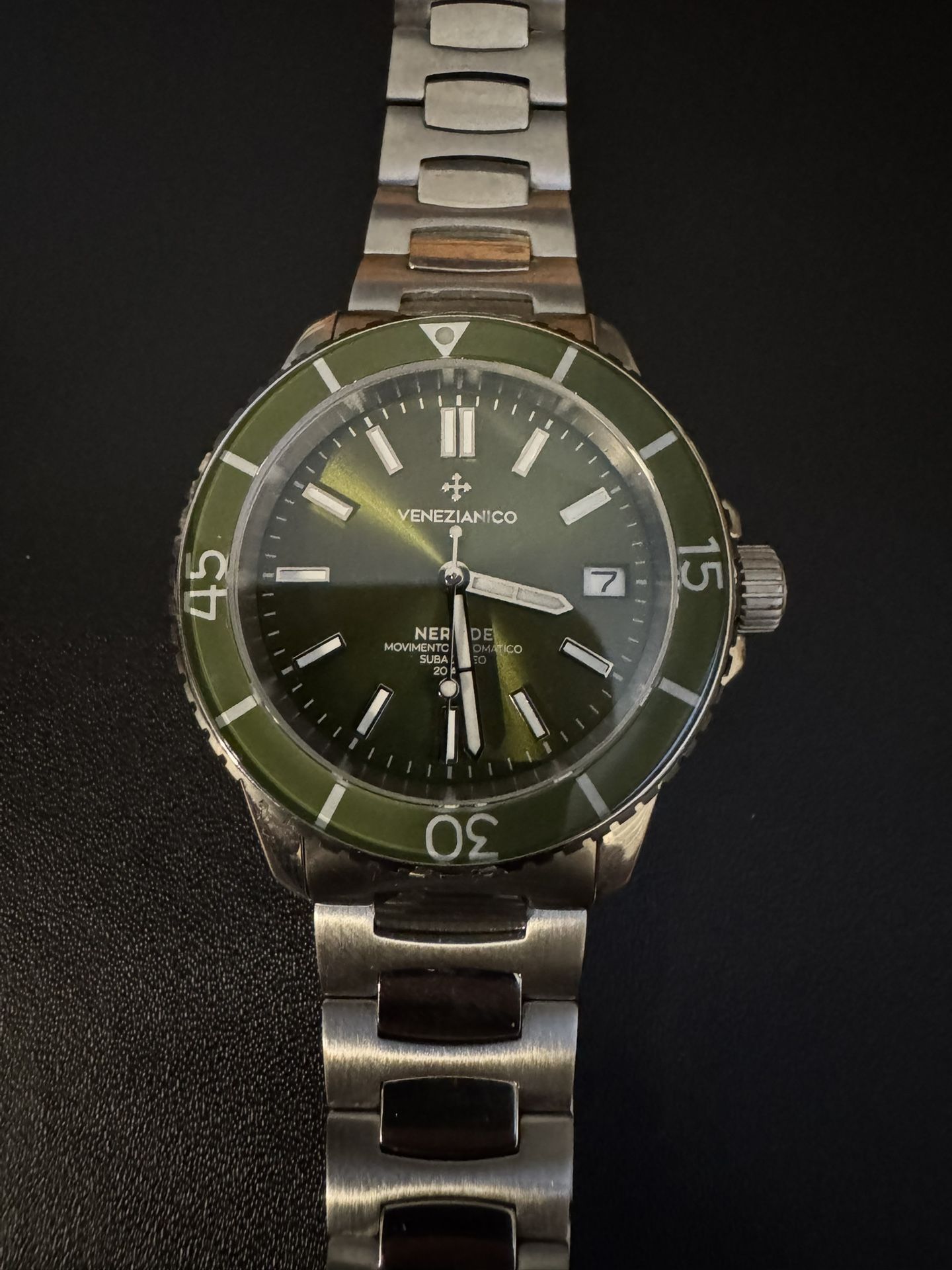 • Venezianico Nereide 39• •CASE MATERIAL: 316L Stainless Steel DIMENSIONS: Ø39 mm, lug to lug 45.50 mm MOVEMENT: Automatic Cal. Seiko NH35A CRYSTAL: Sapphire Glass with anti-reflective coating LUMINOUS MATERIAL: BGW9 Super-LumiNova® BEZEL: BK7 Crystal, 120 clicks WR: 20ATM (= 200mt) BRACELET: Canova• • Watch is like new without box or papers • • Watch sells for $565.00 before taxes ( sold out)• • No trades! No shipping! No lowball offers!• • Thanks for looking!•