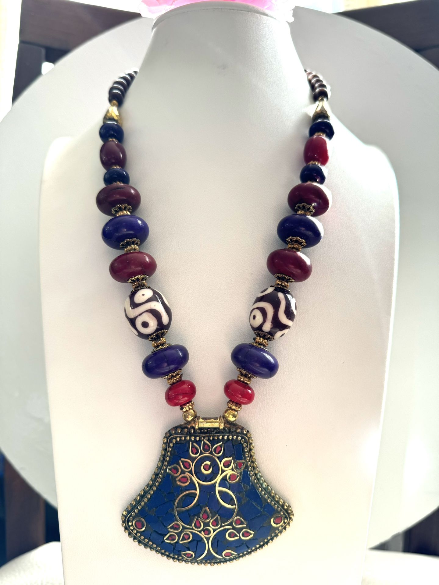 This beautiful and vintage Tibetan tribal theme necklace is handmade with resin beads,yak bone and brass metal with gold tone. Pendant is inlaid with lapis and coral stone. This beautiful necklace length is 19”inches long. Great piece to add with your jewelry collection from Asia🙏
