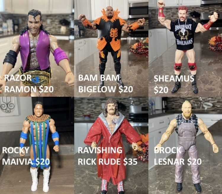Prices are listed below: 2015 WWE Mattel Elite Defining Moments Series 6 Razor Ramon - $20.00 2011 WWE Mattel Elite Legends Series 5 Bam Bam Bigelow - $20.00 2013 WWE Elite Collection BOPPV 2012 Sheamus TRU Exclusive - $20.00 2014 WWE Mattel Elite Flashback Rocky Maivia Target Exclusive - $20.00 2020 WWE Mattel Elite Series 77 Ravishing Rick Rude [Chase] - Custom Build - $35.00 2022 WWE Mattel Elite Collection Series 99 Brock Lesnar - $20.00 These are all pre-owned, gently used figures. They have been displayed and played with. They may have minor paint loss and/or paint transfer. THEY ARE ALL AVAILABLE unless otherwise noted. I have LOTS of WWE figures and accessories. Message me to find out more. *I can provide shipping upon request. I take PayPal & Venmo as well.