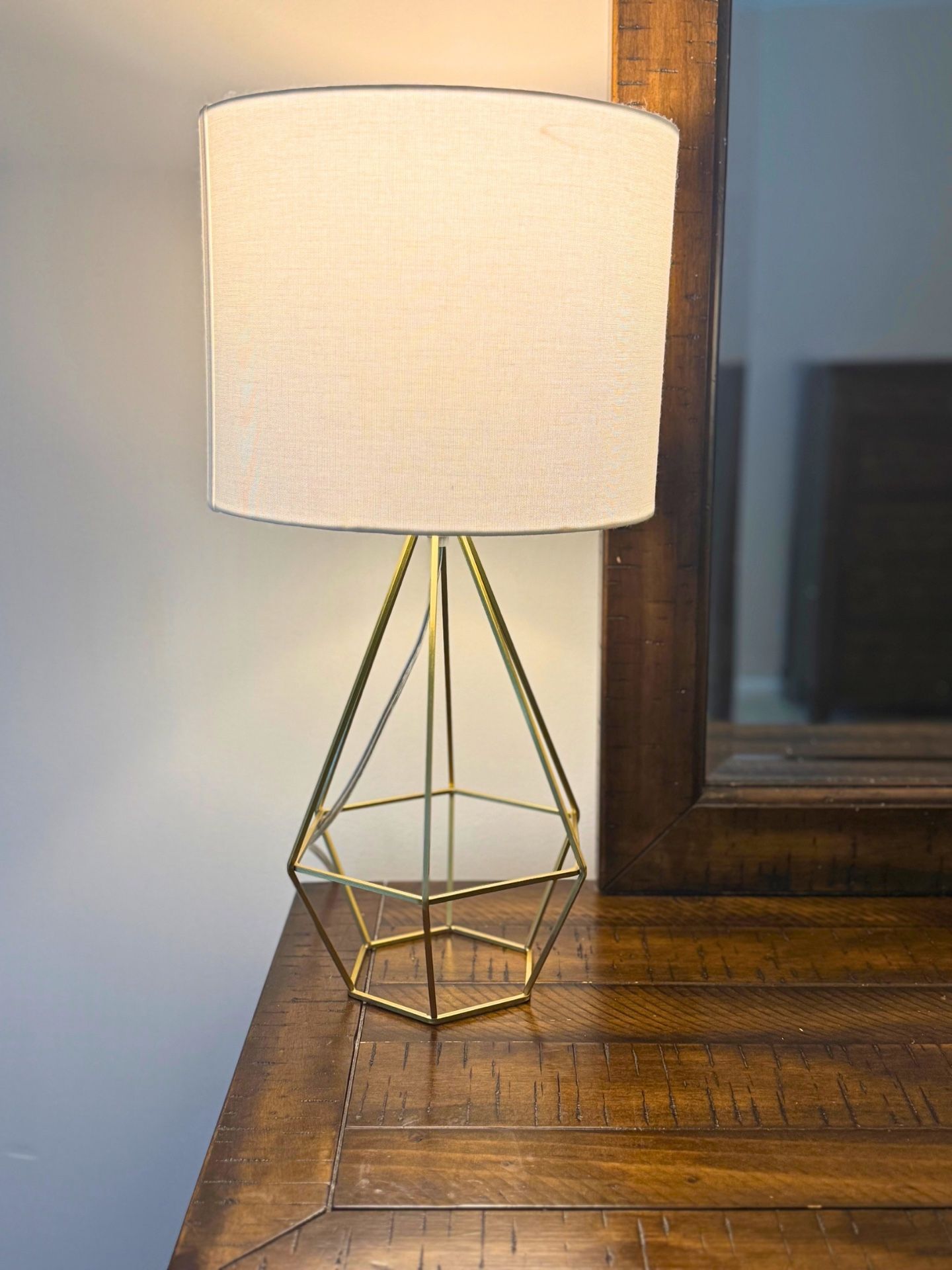 Selling a matching pair of modern gold geometric table lamps with linen shades. Both in perfect condition. Paid $60 each new. • Height: 21.5” • Gold geometric base design • Includes shades (as pictured) • Uses standard bulbs (not included) • Clean, modern look – great for bedside tables, living rooms, or entryway 💵 Pricing: $45 for both or $25 for one