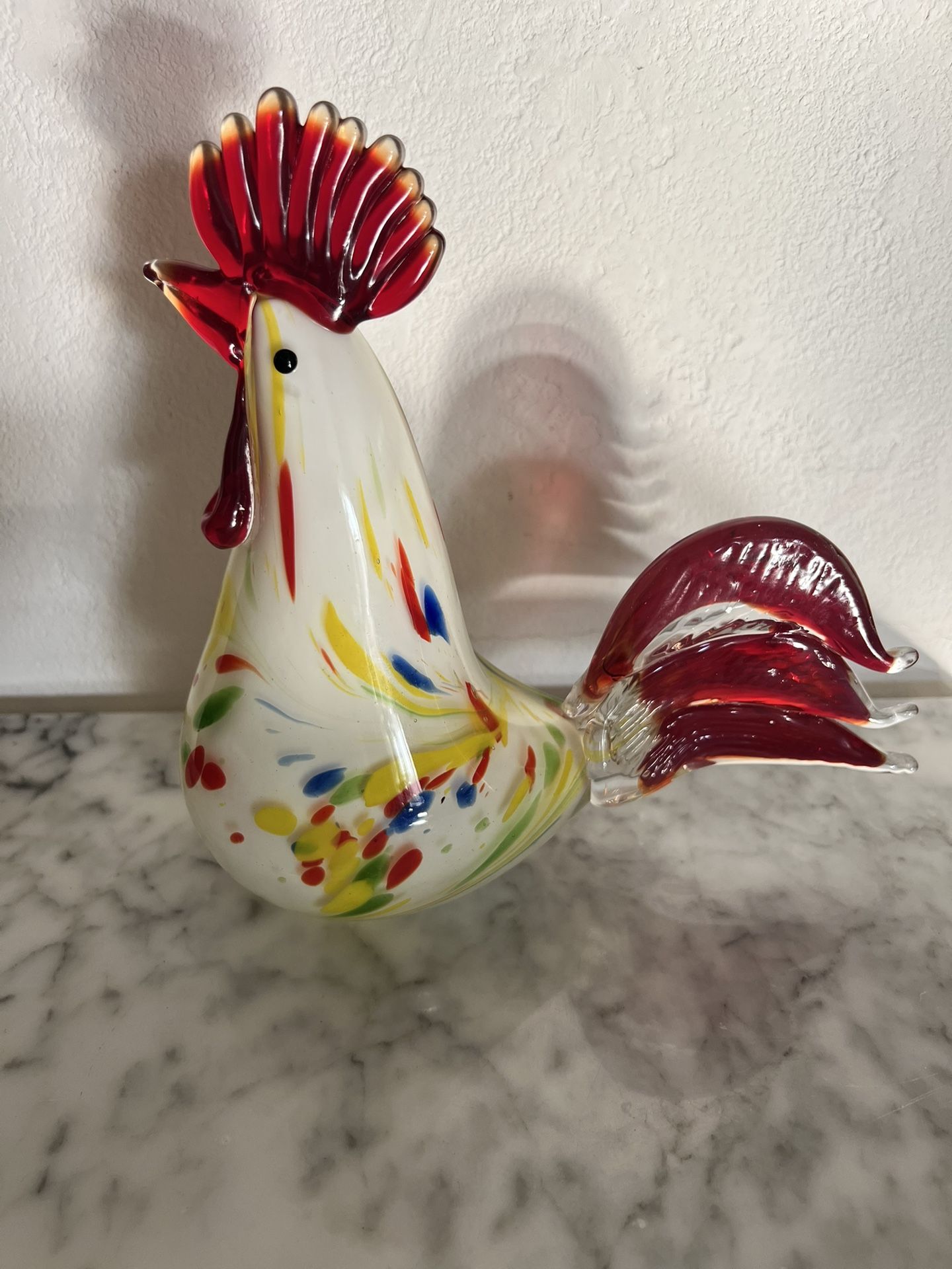 Murano Glass, made in Italy, Colorful beautiful handblown glass rooster, has unique marking on one side area, as each one made is a one of a kind. About 8.5” x 4” Weight is three pounds Murano glass is a type of glass made on the island of Murano, near Venice, Italy, using traditional Venetian techniques. The figurine is hand-blown glass and features a white body with red, yellow, and blue speckles, as well as a red comb and tail. Rooster figurines are a popular type of Murano glass art and are often a symbol of good luck