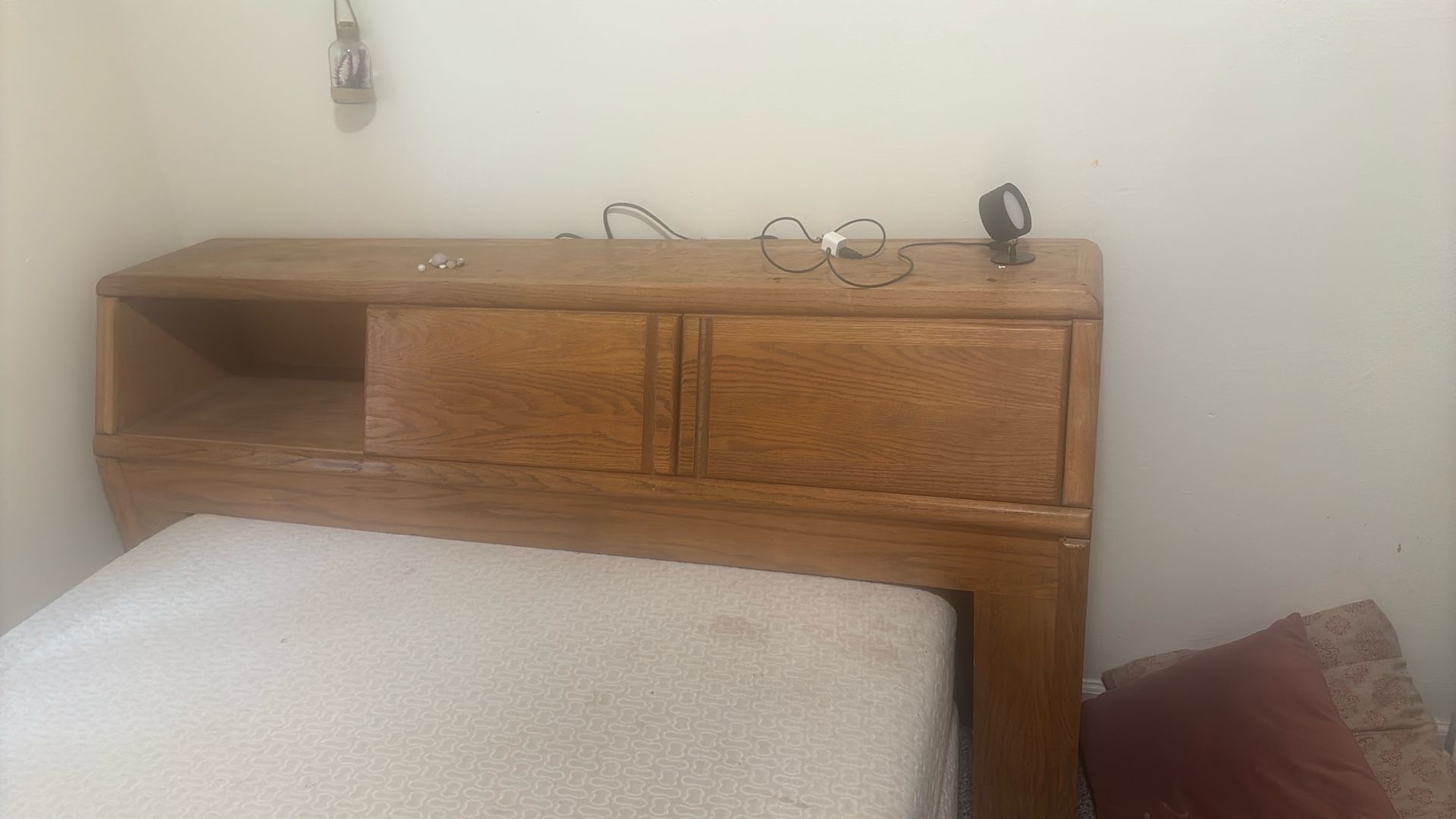 Wooden headboard with sliding doors also comes with cords that plug in for electricity like lights! Moving sale everything must go check my page for more items! Obo Obo Obo Obo Obo Obo Obo