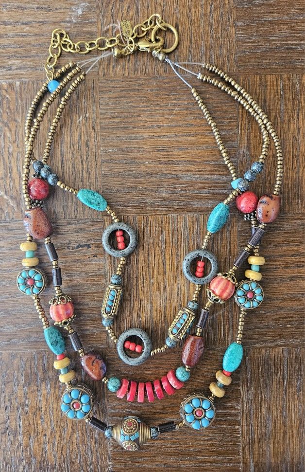 Treska 3 Strand Beaded necklace with Red, Gold, Turquoise and Brown In perfect condition About 10" from lowest ring of Adjustable clasp Beautiful accent piece!
