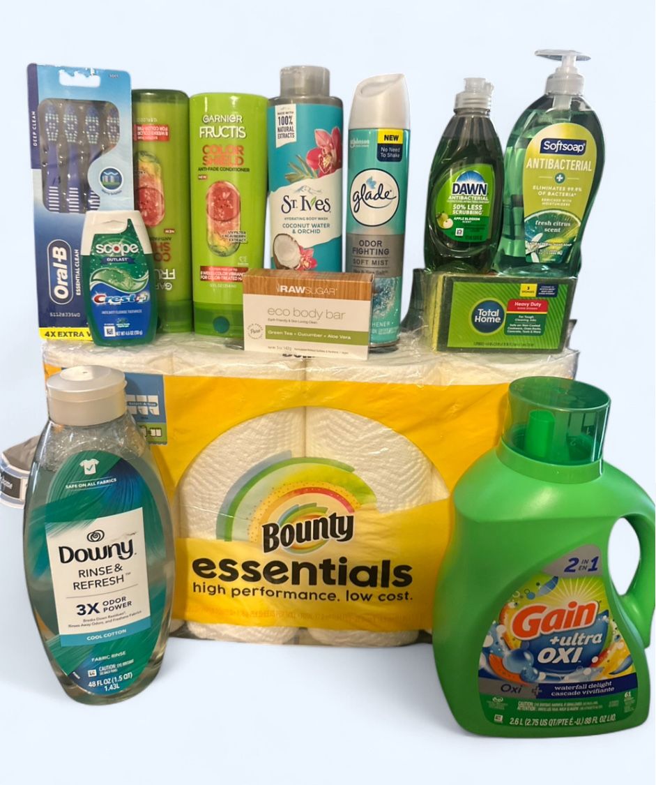 Bundle Includes: 1. Downy Rinse & Refresh – Cool Cotton, 48 fl oz 2. Gain Ultra Oxi Liquid Laundry Detergent, 88 fl oz 3. Bounty Essentials Paper Towels – 4 Double Rolls 4. St. Ives Body Wash – Coconut Water & Orchid, 22 fl oz 5. Garnier Fructis Shampoo – Color Shield 6. Garnier Fructis Conditioner – Color Shield 7. Oral-B 4-Pack Toothbrushes 8. Crest Scope Toothpaste 9. Glade Odor-Fighting Mist Spray 10. Dawn Antibacterial Dish Soap 11. Softsoap Antibacterial Hand Soap 12. Raw Sugar Eco Body Bar – Green Tea + Cucumber + Aloe 13. Total Home Heavy-Duty Scrub Sponges (3-pack)