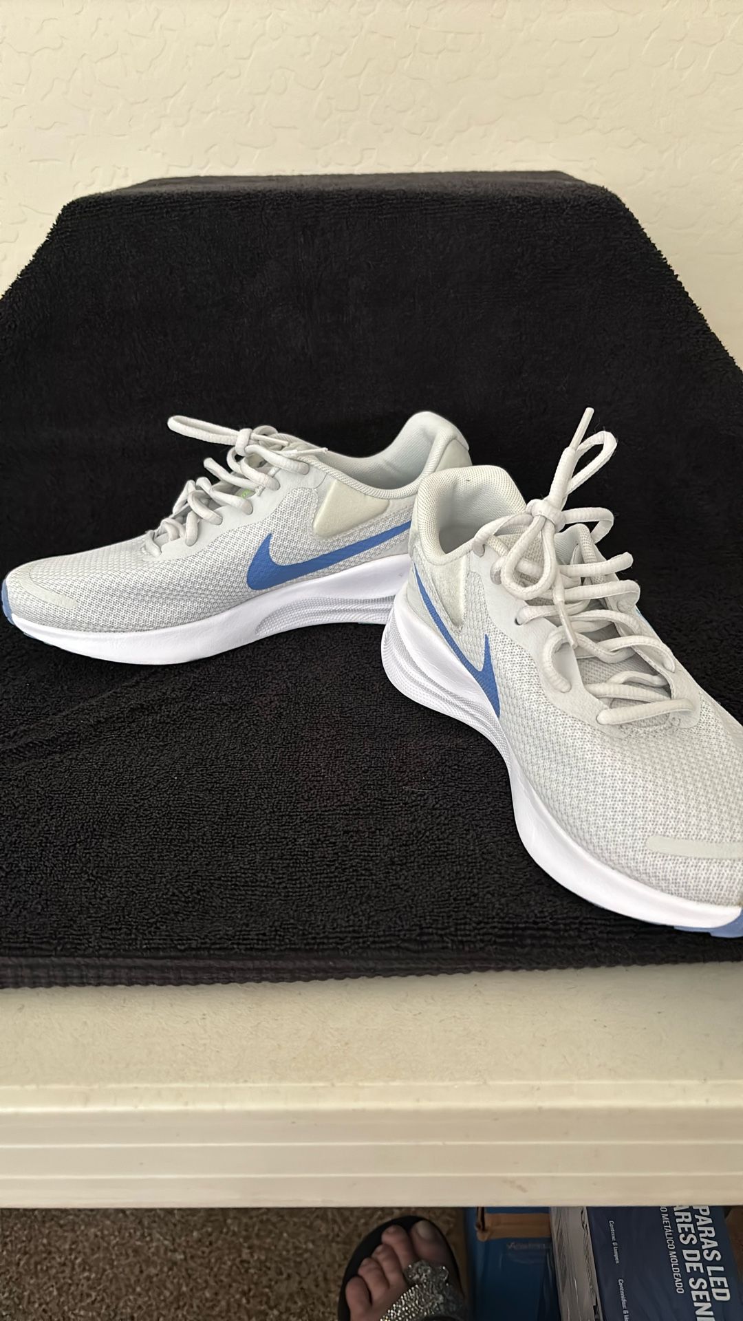 Brand new pair of never worn size 8 light gray with light blue Nike swoosh comfort tennis shoes. Have the box if you would like it. Let me know if you have any questions if you’re seeing this post, they are still available. See my post for other shoes.