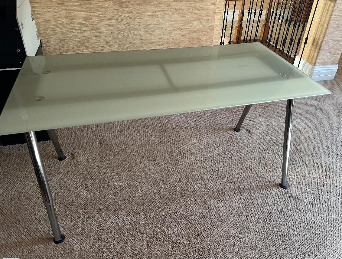Glass Desk - Ikea Galant (Excellent Condition) See image (It is disassembled and ready to be picked up. Very easy to just screw in the legs, takes 5 minutes or less) Easy to transport, easy to pick up. Used at a private residence with super clean people (practically OCD) $100 - quick to answer on email and then text. Thanks!