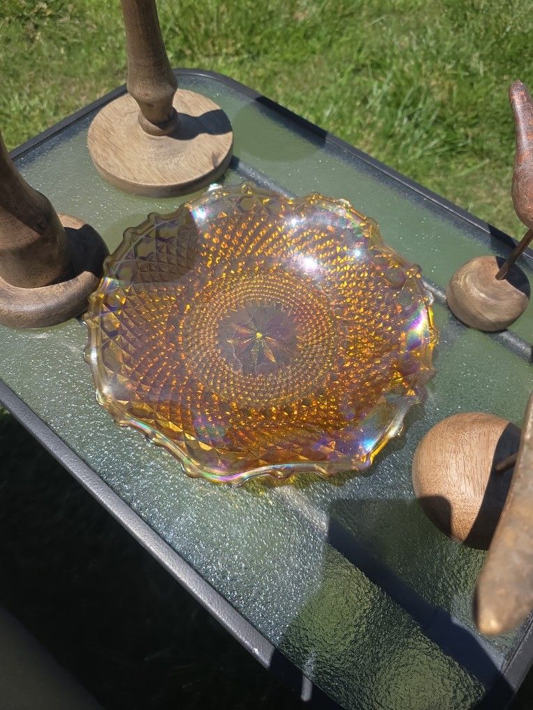 Iridescent Golden color, from the late 70s. About 10 inch diameter. Can be used as a Candy Dish/Bowl No low ball offers.