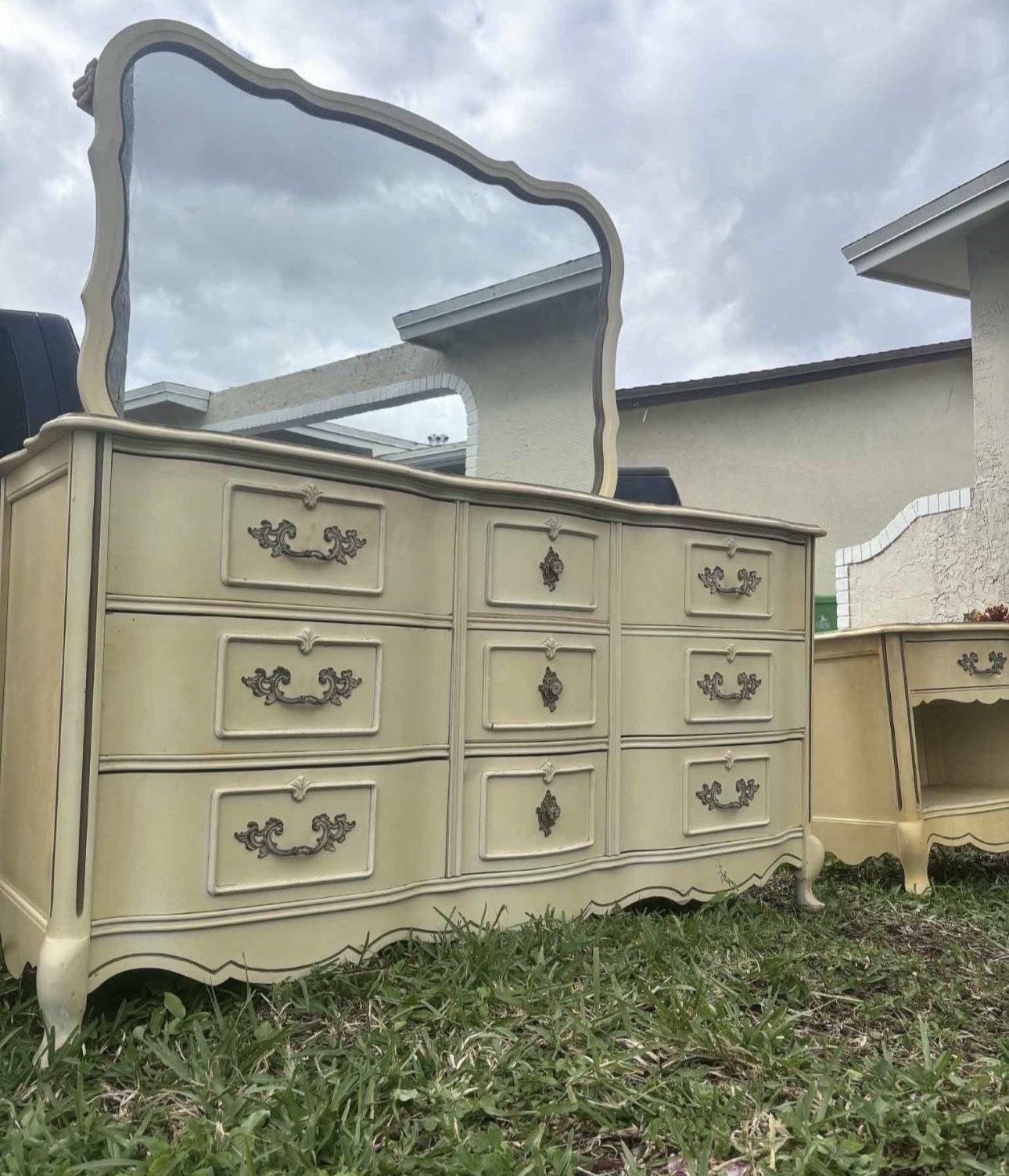 Vintage French Provincial Bedroom Set Dresser With Mirror Upright Chest Nightstand 61”Lx20”Wx33”H Dresser 24”Lx15”Wx24”H Nightstand 34.5”Lx18”Wx47”H