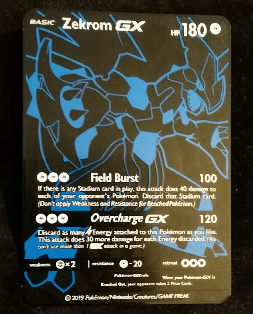 This listing is for 1x Pokemon Card: Zekrom GX!!! This beautiful card is printed on real textured metal and looks absolutely gorgeous! These metal cards are very rare custom cards. Great card to add to your collection!