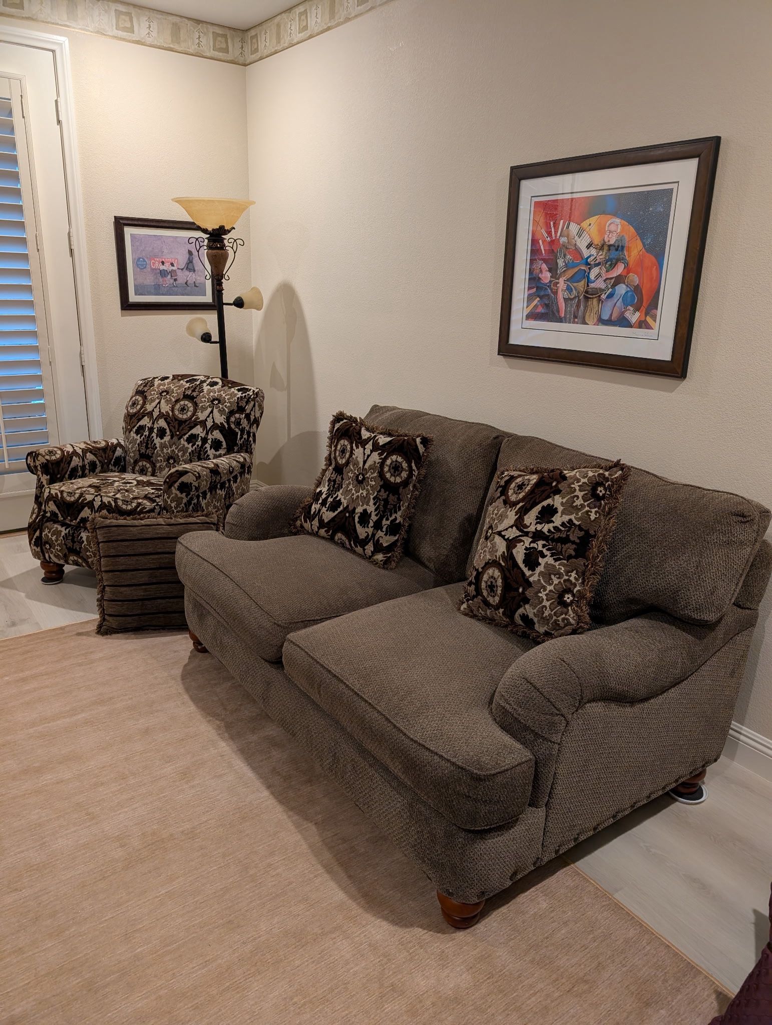 Taupe and brown matching loveseat and chair great for a small sitting room. Excellent condition. No pets and non-smoking home. Decorative pillows included. Must pick up.