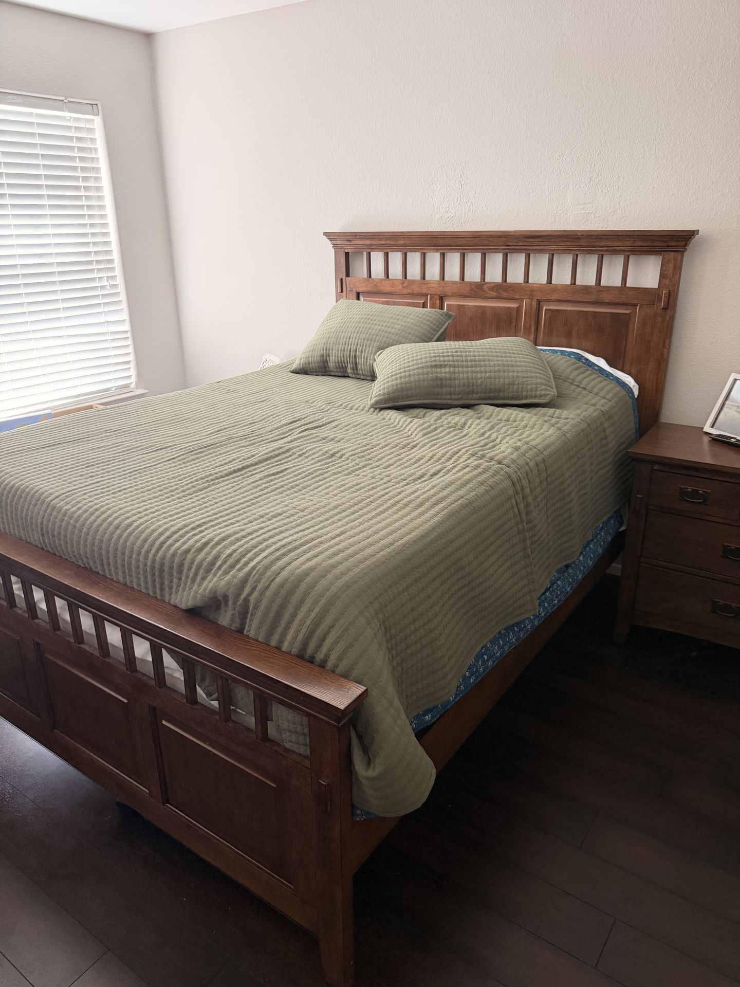 Selling a solid wood bedroom set that includes a Temper CloudLuxe Breeze queen size mattress and box spring. Solid wood queen bed frame, night stand and dresser. Also with a 50” LG 4k smart TV