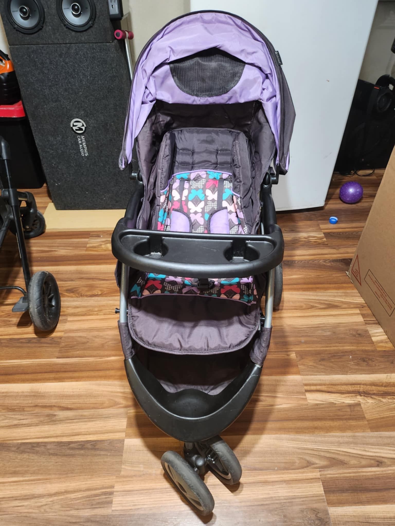 Purple themes stroller has some tear in the bottom basket netting. But still had life to it.