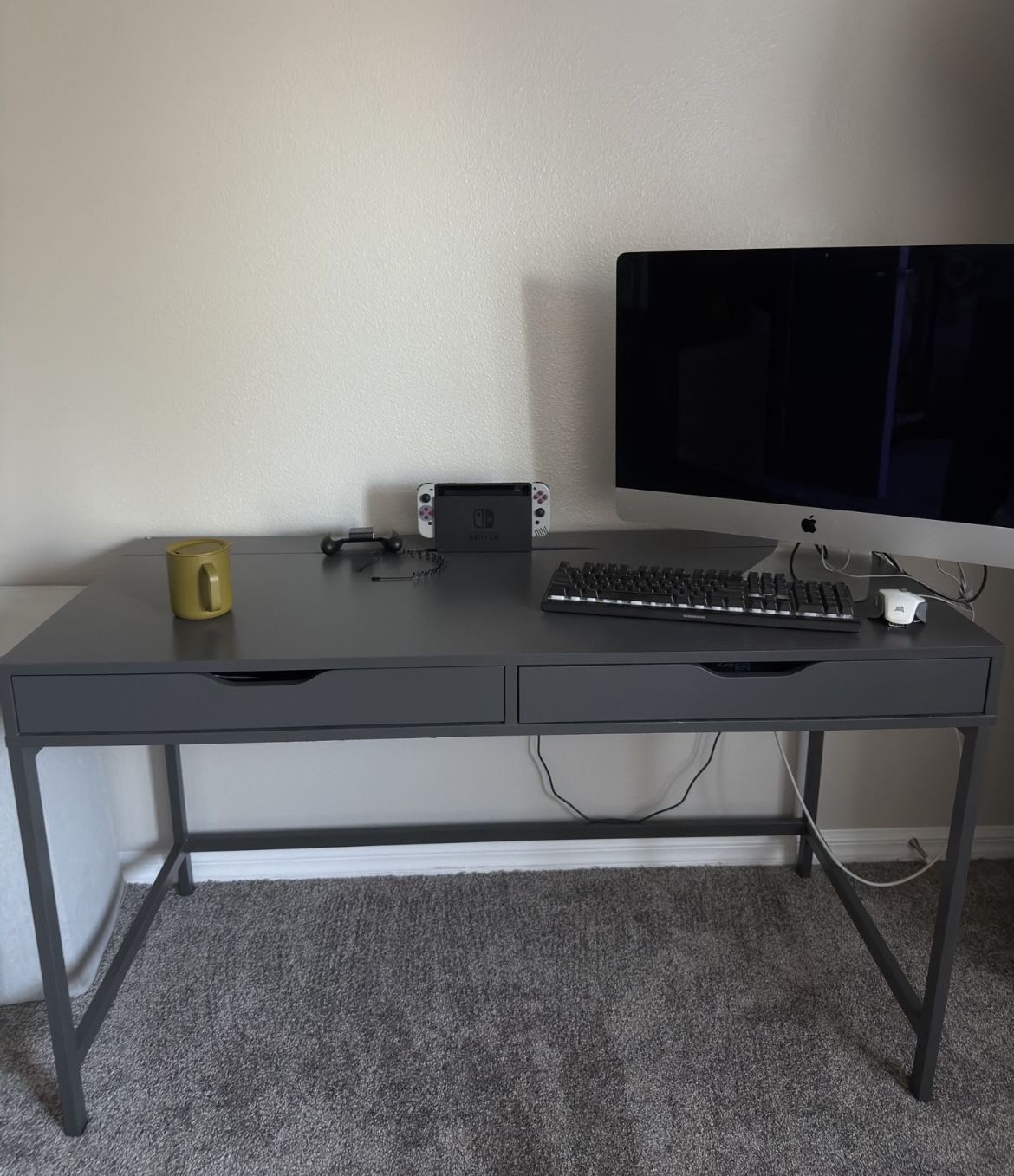 Gray desk. Measurements are provided. Does have scratches, obviously looks used. Will deliver within a 5 mile radius for full asking price. OBO if you’re willing to pick up