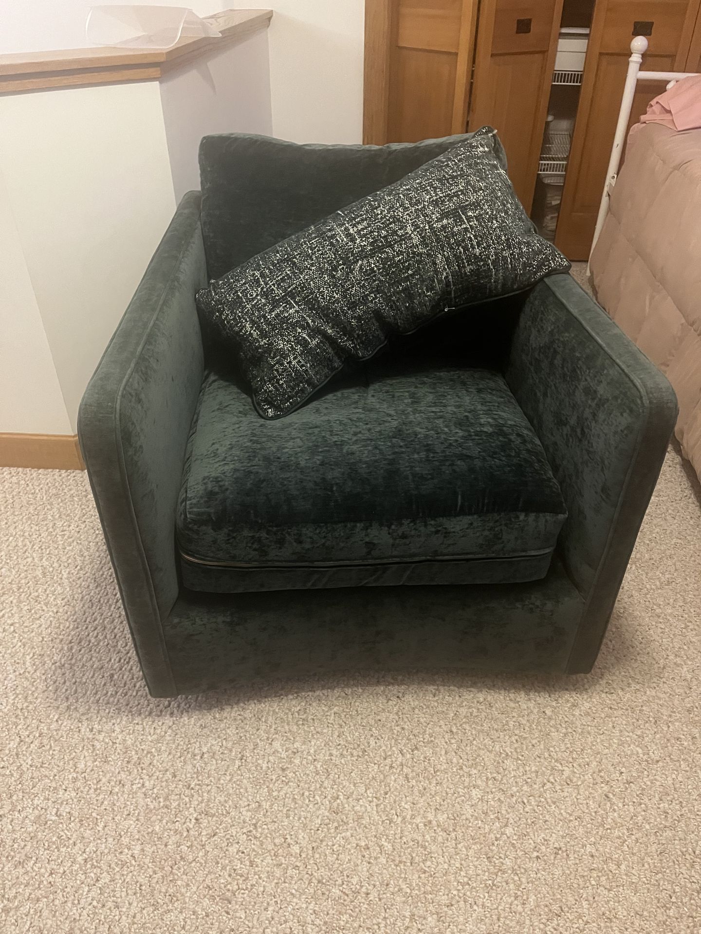 Green Velvet Swivel Chair H 28” D 37” W 29” Floor to cushion 18”