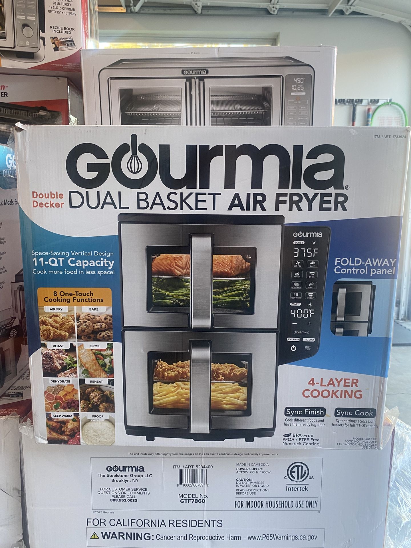 Space-Saving Vertical Design features two 5.5-qt. stacked baskets to cook more food in less space. 8 One-Touch Cooking Functions include Air Fry, Bake, Roast, Broil, Dehydrate, Reheat, Keep Warm, and Proof. FryForce 360� Technology� circulates heated air evenly for crispy perfection - with little to no oil. Use Sync Finish to cook different foods at different temps and times and have them finish together. Use Sync Cook to match settings across both baskets for full 11-quart capacity. Cook up to 4 different foods at the same time by placing the included racks in the baskets. LED Display with Simple Touch Controls to set and adjust settings with ease. Windows & Lights to monitor your food at a glance. All removable parts are nonstick & dishwasher safe for easy cleanup. Cook many & more foods in less space with the Gourmia Dual Basket Air Fryer which features two stacked and synced 5.5-QT. baskets. The baskets work together to redefine what you can accomplish in an air fryer. Sync Finish: Cook different foods at different temps and times and have them finish together. Sync Cook: Cook large batches by matching settings across both baskets for full 11-qt. capacity. Place the included racks in each basket to cook up to 4 different foods at the same time. All removable parts are dishwasher-safe and feature PFOA / PFTE-Free nonstick coating.