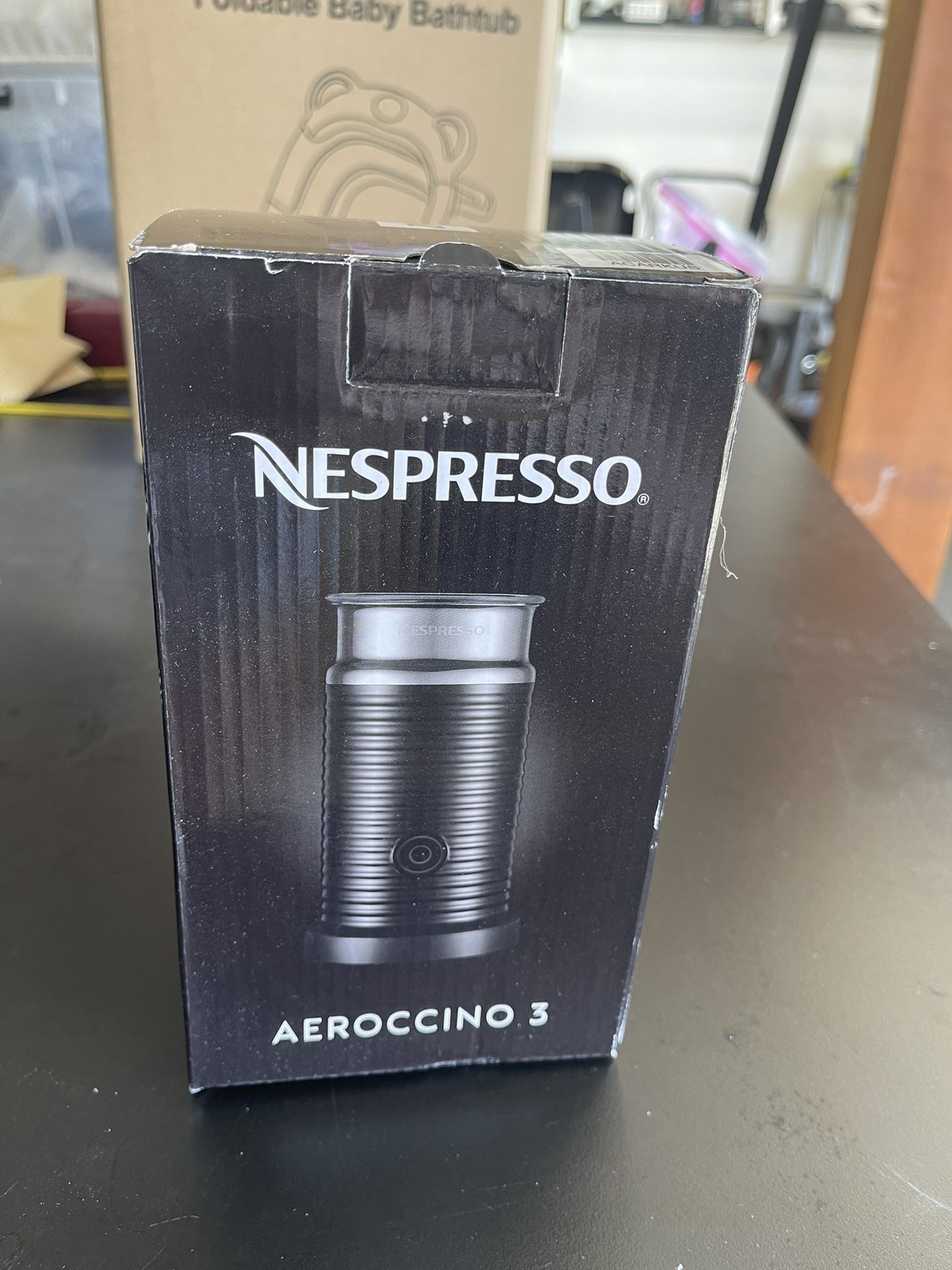 Brand New, Never Used! The Nespresso Aeroccino 3 milk frother makes hot milk foam, hot milk, or cold froth, making it the perfect addition to your coffee maker or espresso machine. It has a simple one touch operation, and you use one second of button pressure for hot milk and froth, and two seconds of button pressure for cold milk froth. Quickly heats up milk to between 160 and 170 degrees Fahrenheit. The Nespresso milk frother has a maximum hot & cold milk froth capacity of 4.1 oz and a maximum hot milk capacity of 8.1 oz. Cash only - $60