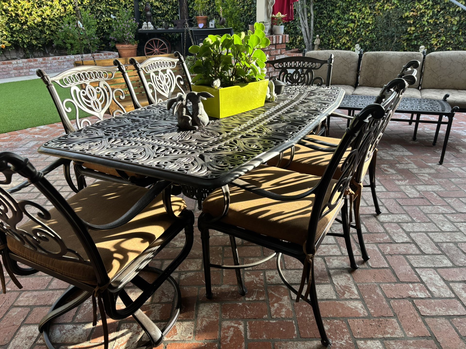 Six piece table ( 70” x 42” ) with chairs and cushions . Couch (79” long) with cushions . 42” x 22” wide table . Lounge chair with ottoman . And a fountain .