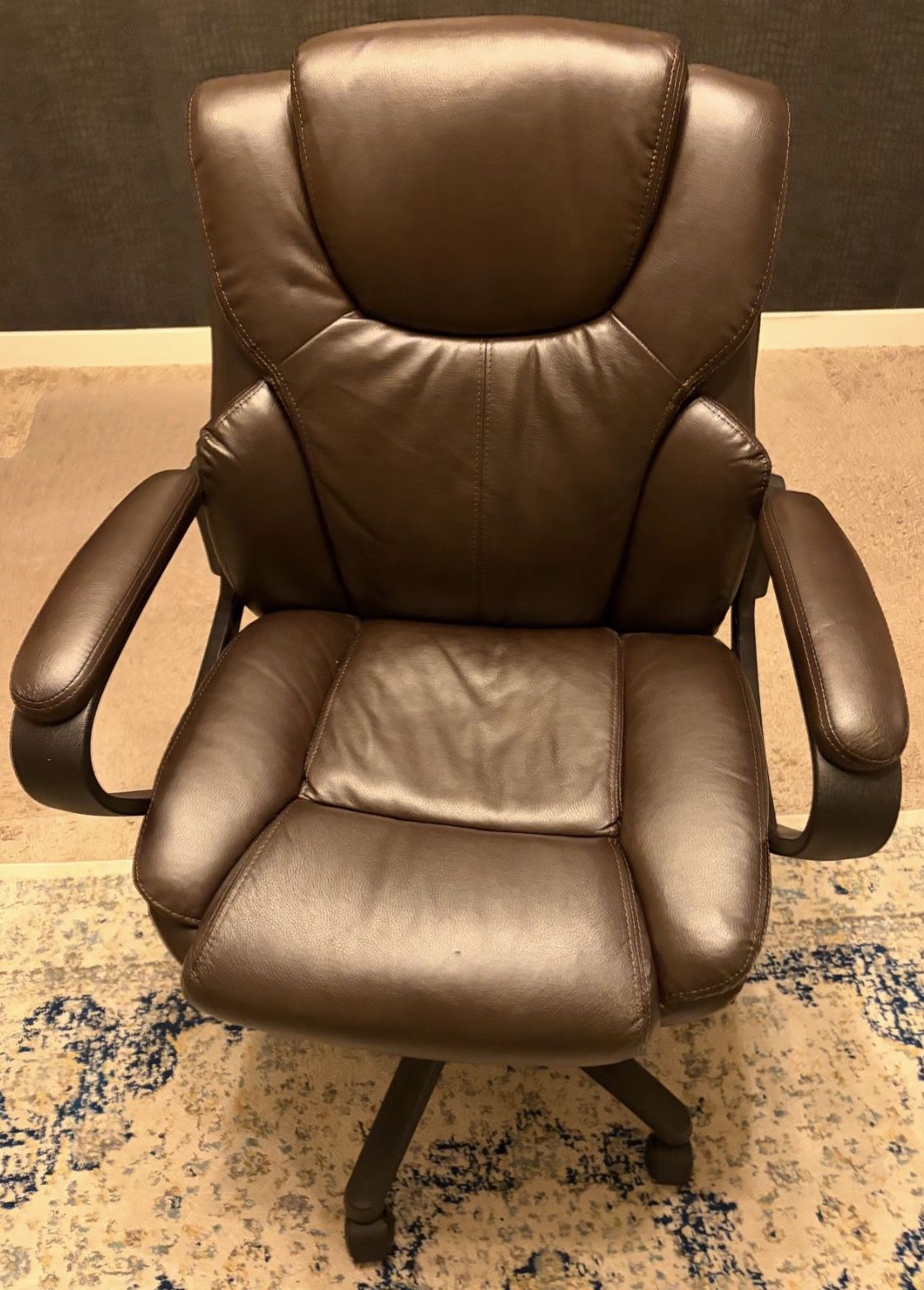 Barely used. Comfortable office chair Brown Leather Adjustable Plus plastic rug protector 2 weeks after I got it, I got a new job and no longer work from home.