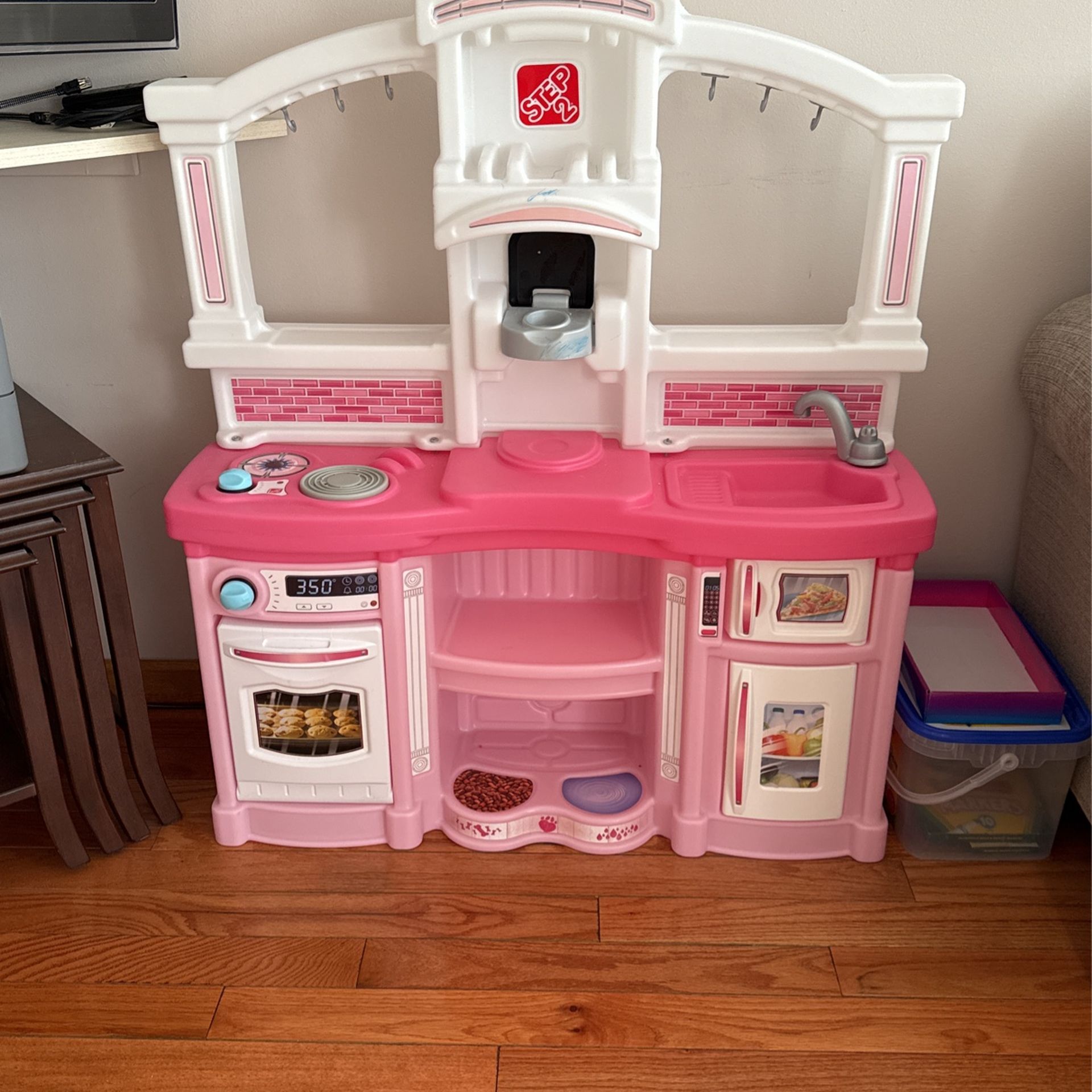 Plastic material Pink A little colored with a blue because of kids Functional doors (oven/kitchen) As is.