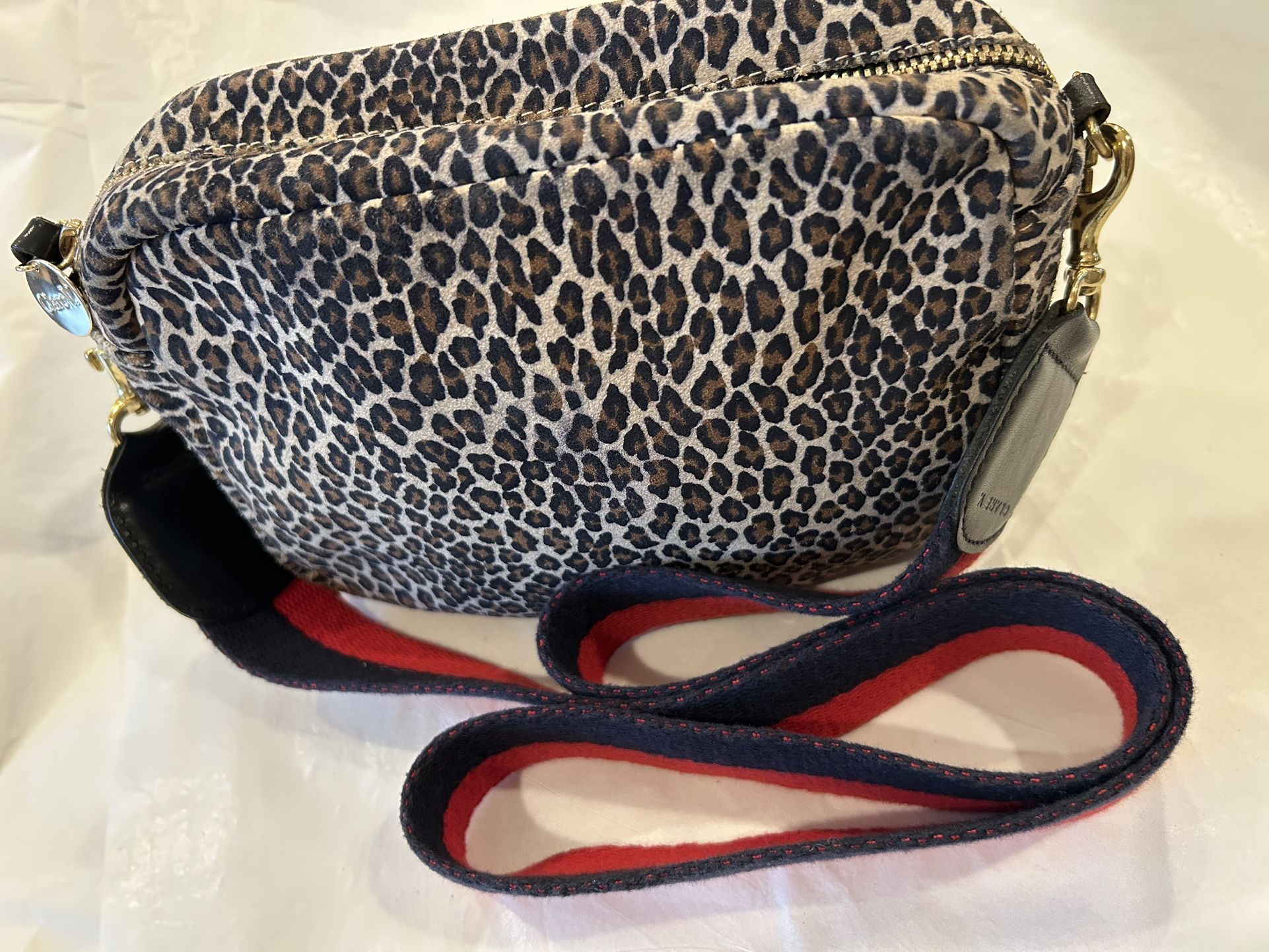 Designer Purse For Sale. Clare V. Los Angeles Purse. Purse measurements are: Approximately 6” width; 9” length; 3-4” depth Shoulder Strap measurements: 1 1/2” width; 40” Shoulder Strap length, with 1 gold metal clip fastener on each end of Strap , measuring 1 1/2” each. Leather Leopard Print exterior/ Cotton-like lined interior. Clare V. Los Angeles leather tag sewn inside. Small white tag also sewn inside which states : ‘Made in USA of imported materials’ Long Shoulder red/black Strap, made with black leather ends holding Gold Metal clip fasteners that attach to both sides of the purse. Also has gold coin like metal charm attached to the black leather Zipper Pull. Used; in good condition. $100 or Best Offer.