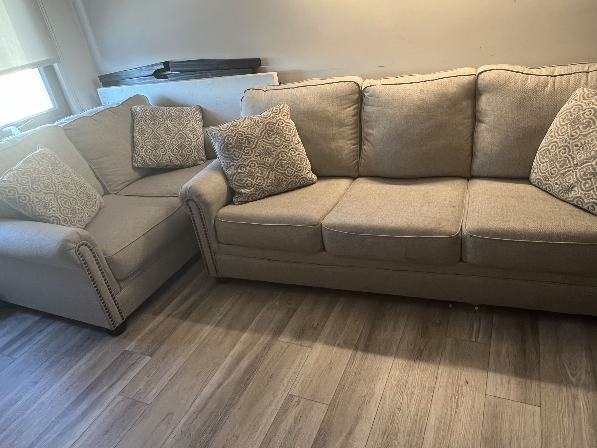 Comfortable and stylish Ashley 2-piece sofa set including a full-size couch and matching loveseat. Upholstered in a neutral beige fabric that fits easily with any decor. Both pieces are in great condition with no major damage—well maintained in a clean home. Features: • Includes sofa + loveseat • Soft, durable fabric upholstery • Neutral color (easy to match) • Comes with matching accent pillows • Deep, comfortable seating Perfect for living rooms, apartments, or guest spaces. Ready for pickup!