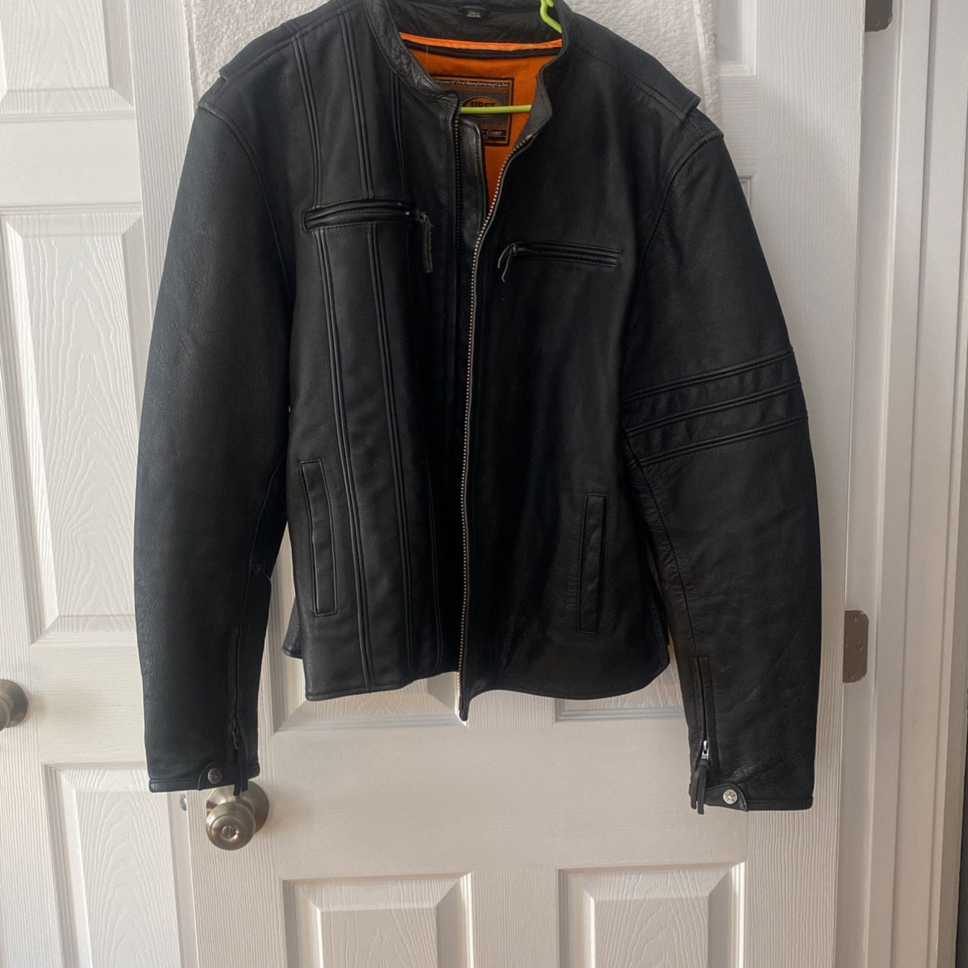 Size XL great quality leather jacket many zipper pockets zipper & snap button cuff sleeves like new condition