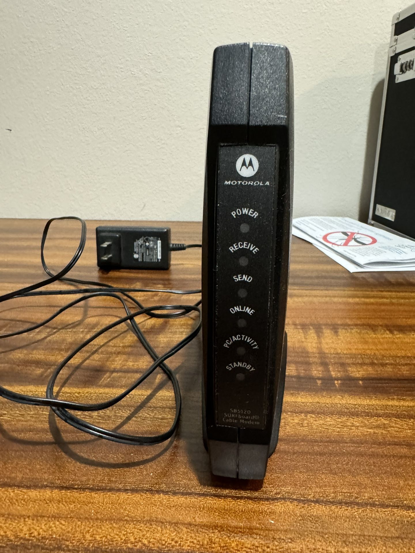 Title: Motorola SB5120 Surfboard Cable Modem. Model: SB5120. MPN: SB5120. Details about the item: Includes Modem, Network Cable and Power Adapter. Very Good Condition Motorola SB5120 Surfboard Cable Modem.