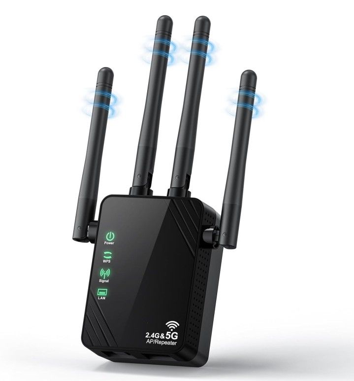 High-Speed Dual-Band Performance —This upgraded WiFi extender uses advanced dual-band tech, delivering 300 Mbps on 2.4GHz & 867–1200 Mbps on 5.8GHz. Reducing interference and data loss, this internet booster ensures smooth streaming, browsing & video calls for stable WiFi throughout your home.Note: WiFi extenders improve coverage, not your incoming internet speed Say Goodbye to WiFi Dead Zones —This WiFi extender signal booster is equipped with high-gain antennas and an upgraded amplifier chip that strengthens weak signals and expands coverage up to 12888 sq.ft. Its enhanced penetration power helps boost WiFi through walls and floors, extending reliable coverage to multi-room homes, basements, garages, and backyards—eliminating frustrating dead zones throughout your house 1-Tap WPS Setup & 99% Device Compatibility —No complex IP configs/tech debugging! Our WiFi extender is plug-and-play: press WPS on router/extender, pair auto in seconds—perfect for all tech levels.Compliant with IEEE 802.11 a/b/g/n & 802.11ac, works seamlessly with 99% routers,gateways & smart devices. Expand WiFi without replacing gear—no compatibility hassles Versatile 3-Mode Operation —This WiFi booster adapts to any network setup with Repeater, Access Point, and Ethernet Bridge modes. Repeater Mode boosts weak WiFi signals to expand coverage across your home. Switch to AP mode to turn a wired connection into a dedicated wireless access point, perfect for enhancing coverage in remote areasi. The dual Ethernet ports allow you to connect TVs, PCs, or gaming systems directly for the highest stability and speed Enterprise-Grade Security —Built with a secure encryption module and advanced protection architecture, this WiFi range extender supports WEP, WPA, and WPA2 security protocols to help safeguard your network. Integrated over-voltage protection and reinforced signal processing add an extra layer of reliability to keep your network and devices safe from cyber risks—fit for daily tasks or sensitive business data