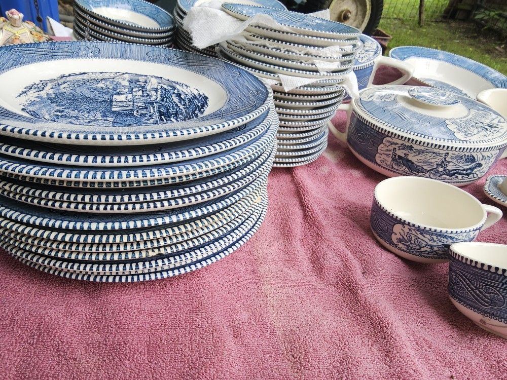 12 dessert bowls, 1 salad bowls, 1 gravy bowl, 13 large dinner plates, 40 small plates , 1 butter dish, 1 sugar bowl, 1 creamer , 10 cups, 4 bowls, and 3 pieces don't know what they're called. Found in my grandmother's collections been in storage for 15 years good condition 4 of the dinner plates have a small chip on the edge of plates but everything else looks good. 87 total pieces i believe these were for display in her home. I don't think they were ever used some pieces still have the original wrapping Pick up only