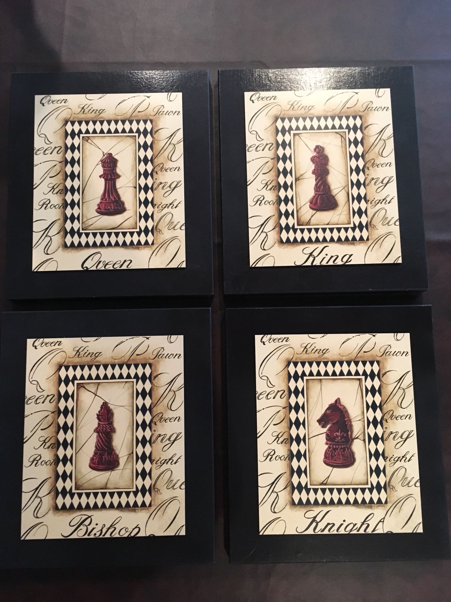 Four chess pieces plaques. Each is 11” wide by 12.5” tall. They are in like new condition.