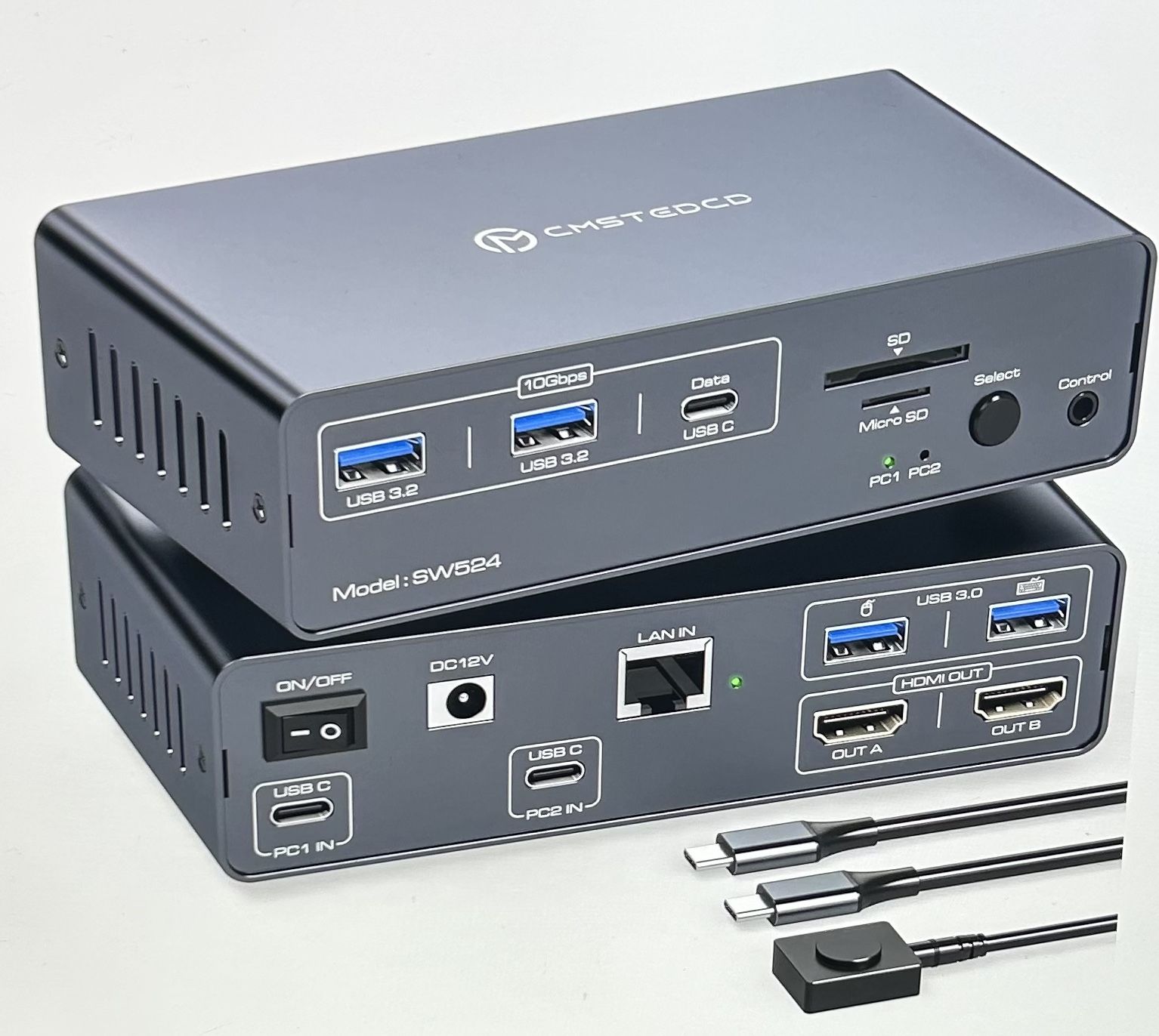 Selling new in box USB C docking station with KVM switch 2 monitors 2 computers 4K @60Hz HDMI EDID KVM switches dual monitor for 2 laptops share a 1G Ethernet 5 USB A/C devices and SD/MicroSD card slots quick easy data transmission mirror mode supported for MacOS control 2 computers & 2 monitors using only 1 keyboard & mouse easily switch between work and personal dual screen mirror mode 12 in 1 multi function docking station variety of ports with Ethernet 1G easy to install & set up plug and play function no driver required retail $140