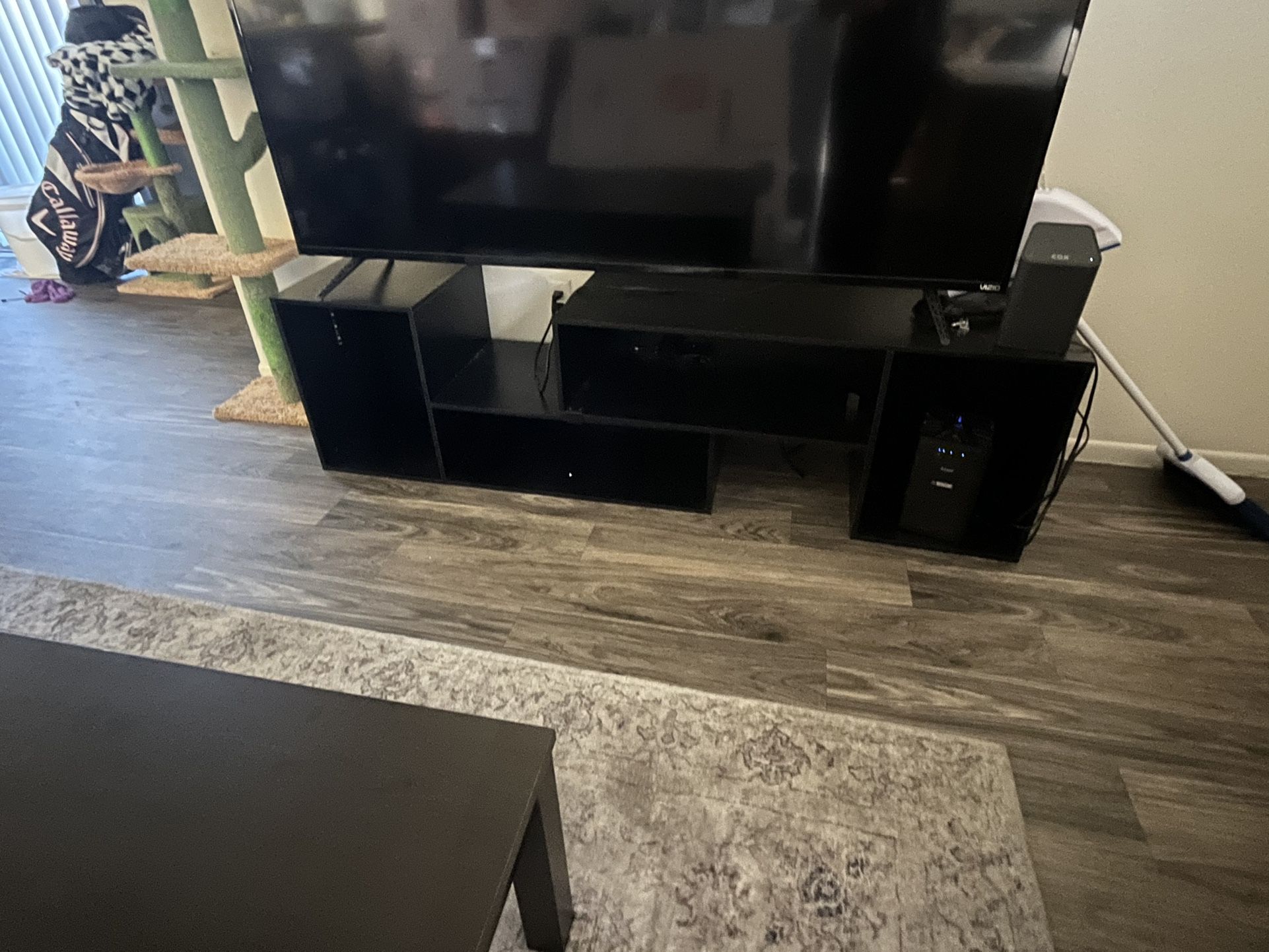 Tv stand for sale. Pictured with a 70’ tv. Measures roughly 6’L x 1.5’W x 1.5’H. You can slide the frame to fit smaller tvs as well.