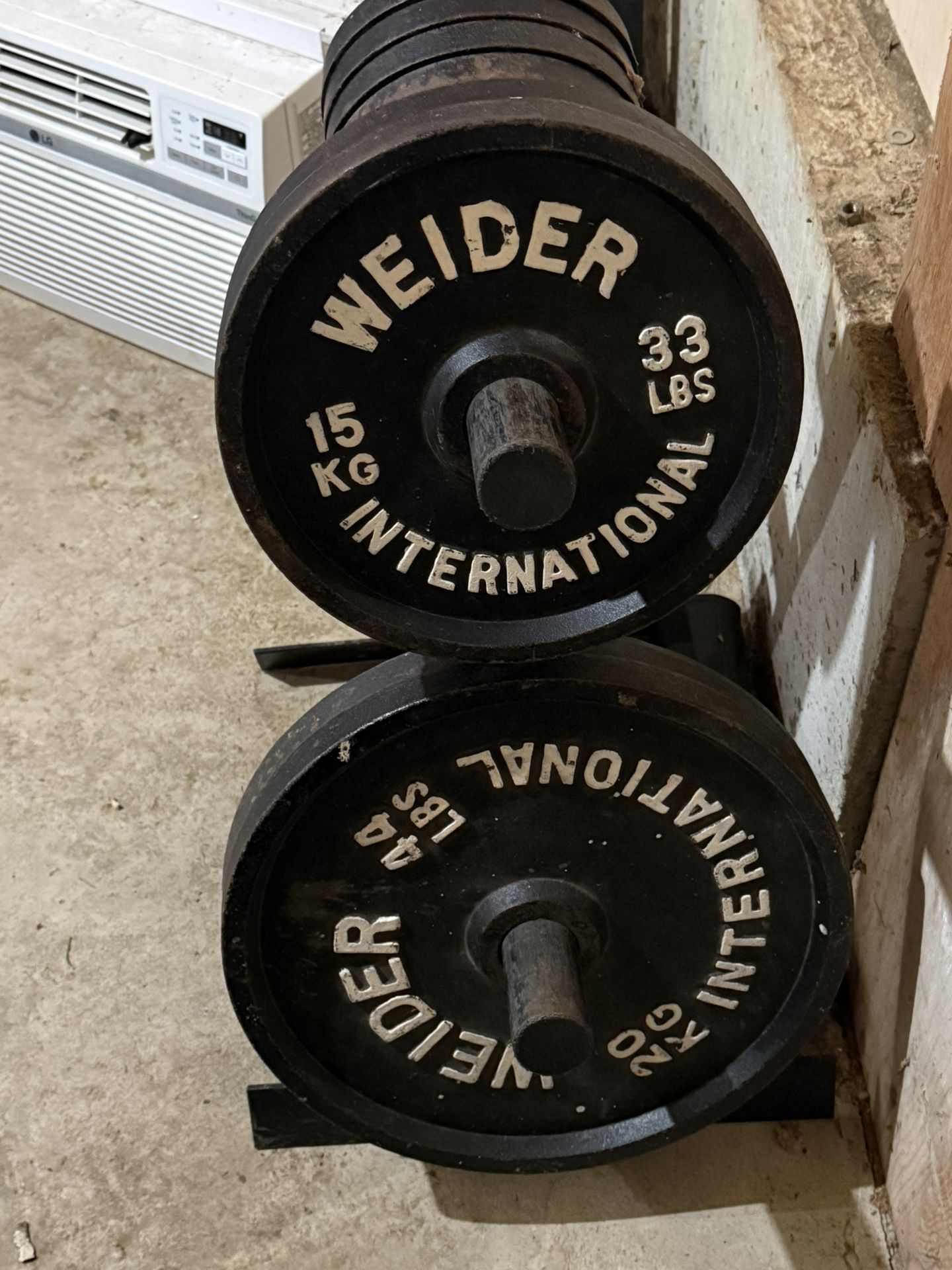 Approximately 250 pounds in weights and stand. Also have unknown brand barbell for $30. $250 for weights, stand, and barbell. Also listing a Titan T3 power rack separately, as well as a bench. Will do a package deal if you want it all