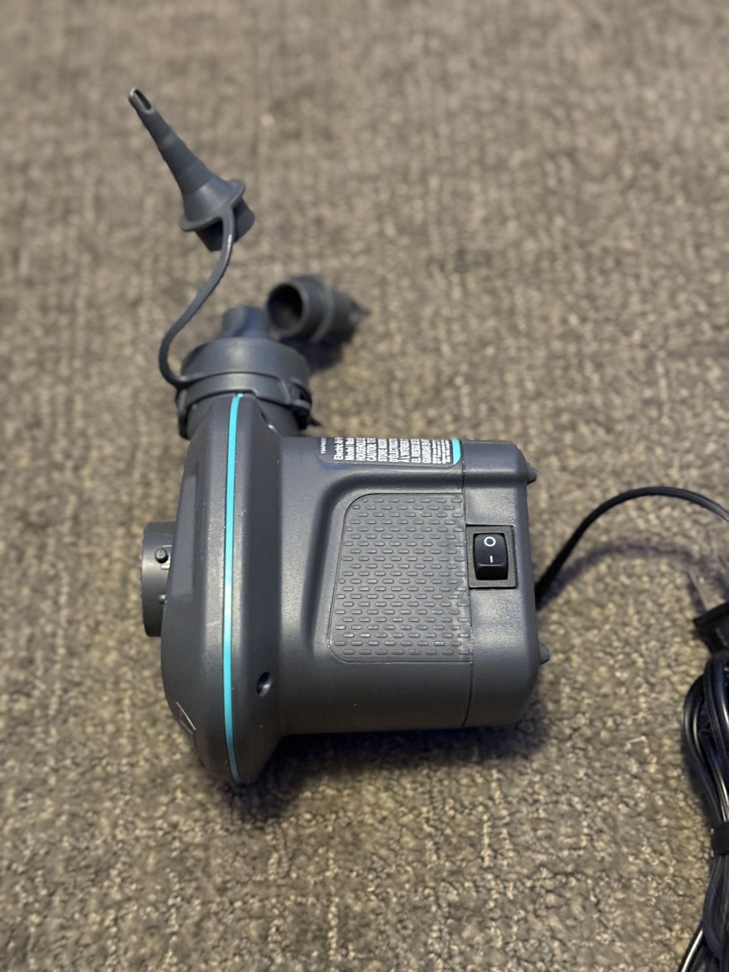 Intex Quick-Fill electric air pump in great working condition. This pump powers on properly and inflates and deflates quickly. Ideal for air mattresses, pool floats, inflatable furniture, rafts, and more. Includes multiple nozzle attachments to fit a wide variety of inflatables. Compact design with on/off switch and standard wall plug (110–120V). Clean and well cared for. Perfect for camping, pool season, guests, or everyday home use.