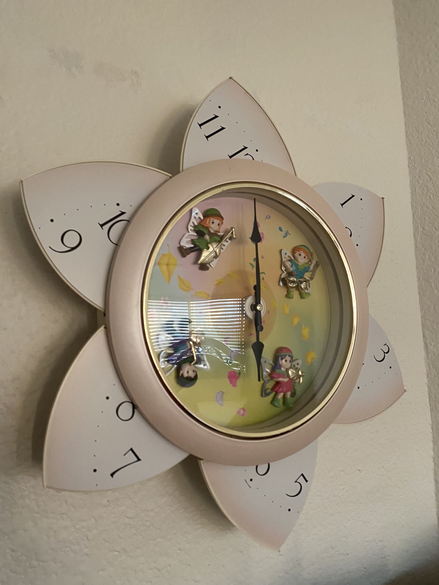 Opens and kids cherubs fairies spin around Plays music then chimes the number of times for the hour movement is very smooth Gorgeous super rare I only found one for sale secondary market (eBay) listed for $250 with scratches on outer edge No scratches or discoloring but the battery back is missing. Doesn’t affect the clock in anyway and when it’s against the wall nobody knows it’s missing. Selling for $150. Pickup in Anaheim Hills