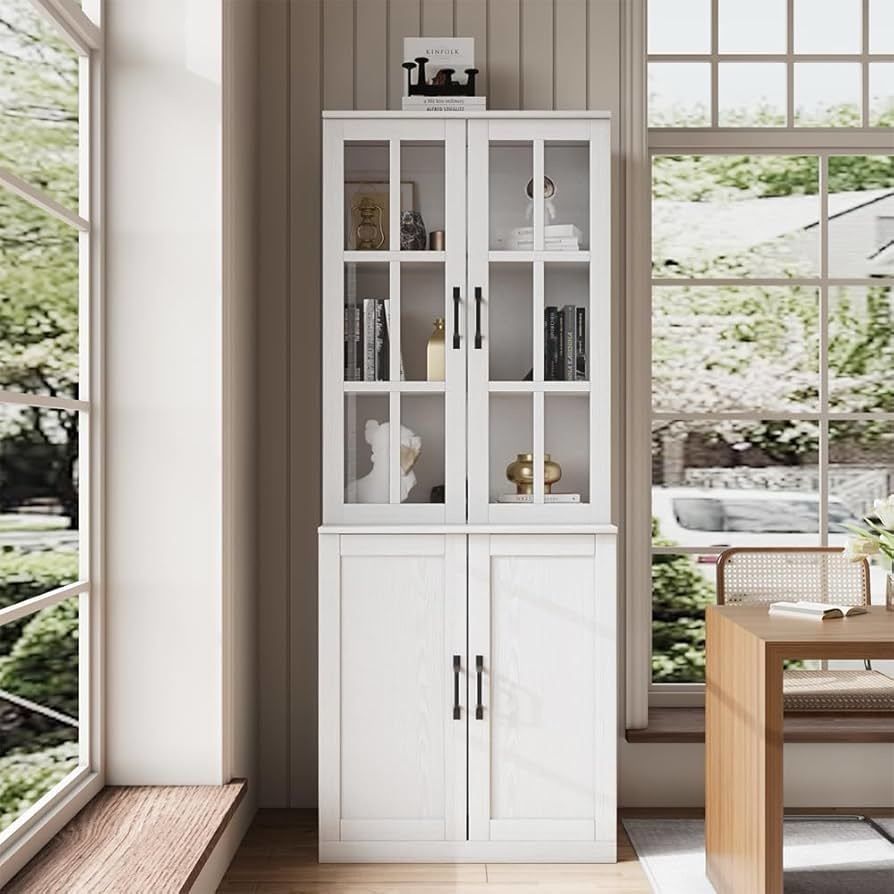B336 $120 Bookcase with Glass Door, 5-Tier Modern Bookshelves with 3 Large Drawer, Glass Display Cabinet with Lager Storage Shelf, Combination Storage Shelves for Home Office, D(White) Color White Material Engineered Wood Recommended Uses For Product Storage Product Dimensions 15.8"D x 23.6"W x 71"H Special Feature Drawer, Glass Door 【DIY Your Cabinets】We designed 5 cabinets A, B, C, D and E. Cabinet A features 4 doors with Spacious countertop, Cabinet B contains 3 large drawers, 2 doors as well as an Spacious countertop, Cabinet C comes with 3 large drawers and 2 glass doors, Cabinet D consists of 4 glass doors and Cabinet E contains 4 doors, 2 drawers and Spacious countertop. They are combined into 14 different sizes and functions of combination cabinets, you can choose different combinations according to your needs, black and white are available. 【Improve Place Tidiness】The multi-layer design enables messy objects to have their designated locations. With full-size drawers and glass doors, it facilitates easy access to documents and office supplies. The free combination design allows you to maximize your office area and create an orderly and neat environment. 【Sturdy and Durable Construction】The white bookshelf storage cabinet is crafted from high-quality MDF and metal fittings to ensure stability and durability. The clear wood grain design enhances the cabinet's texture. The glass door is not only aesthetically pleasing but also durable, providing you with a long-term storage solution. 【Multi-functional Scene】The tall storage cabinet is more modern and minimalist, a valuable addition to any living space or storage area. It is ideal not only for kitchen use but also for garages, reception rooms, or any office setting. It helps organize your place in a tidy and orderly manner. 【Easy to Install & Clean】The board is finely polished, and the surface is extremely smooth and easy to clean. You can simply wipe the wooden storage rack with a soft rag to make it look brand new. We provide all necessary accessories and detailed assembly instructions. The product is delivered in two boxes. All parts should be checked for integrity before assembly. szg-002 usan1057266vn