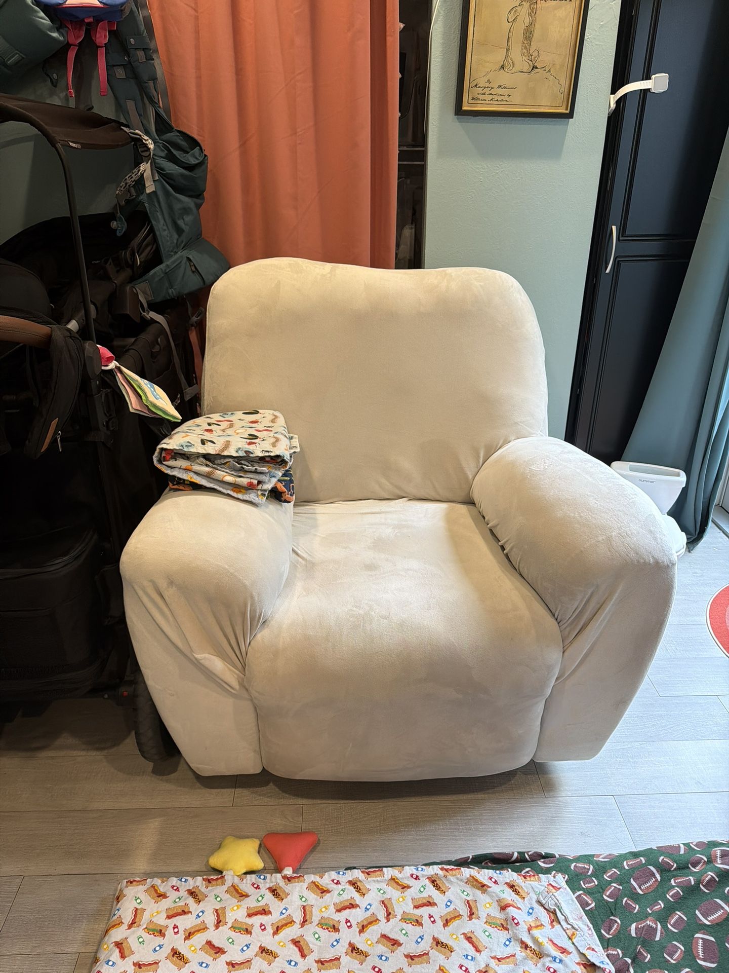 Big and comfortable dark gray rocking chair/recliner. Originally purchased from big lots. I have a cream cover on it for aesthetics. Clean and in great condition. Breaks into two pieces and will fit in the back of a large SUV or truck. You pick up. Located in Little Gables near miracle Mile.
