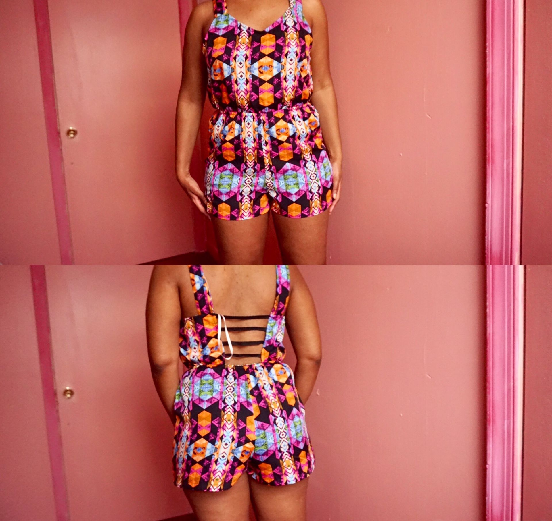 Never really found the place to wear this. It’s a colorful romper without sleeves Size:M Instagram:@tizinisden to see video of item