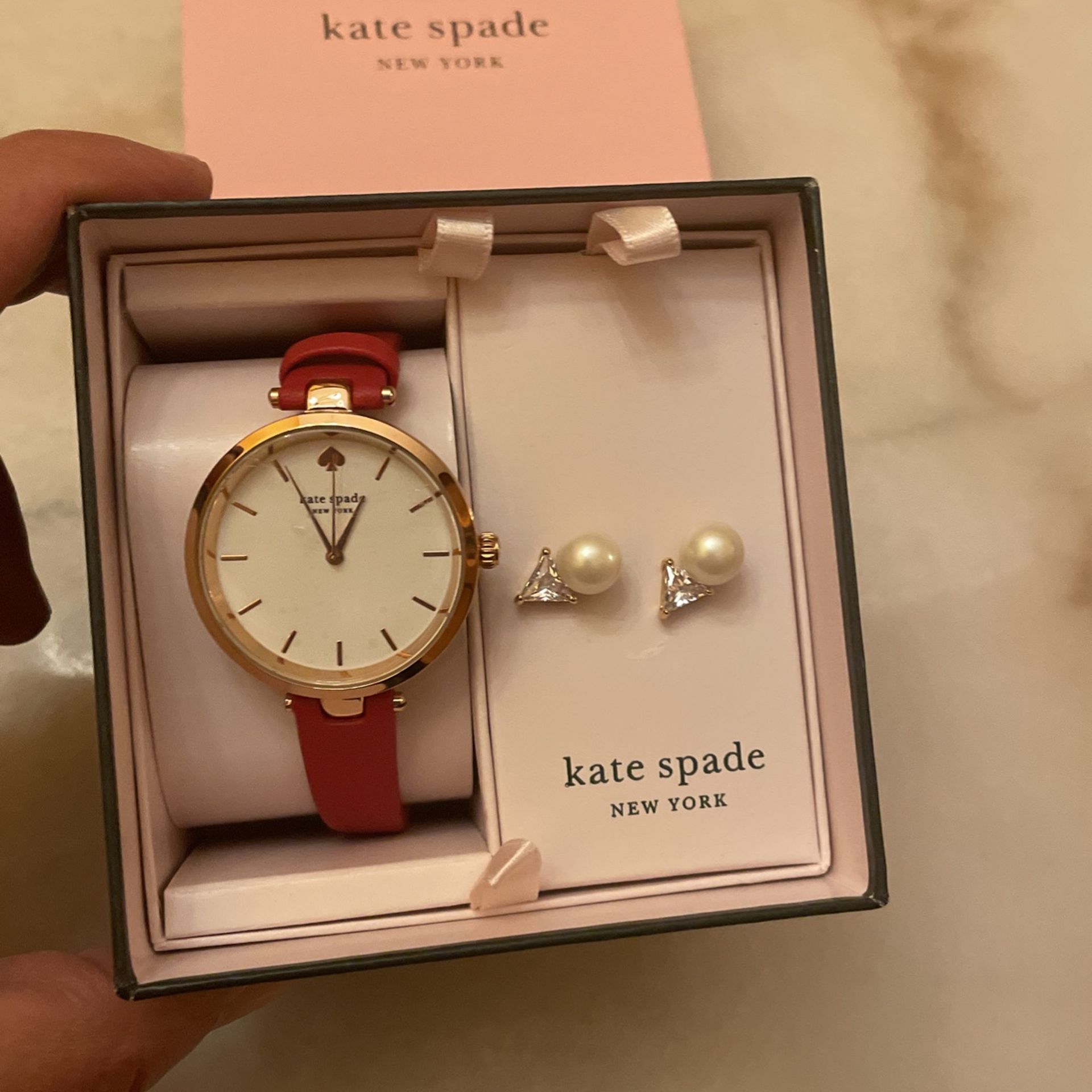 Kate Spade ♠️ New York Holland timepiece and earring set. Brand new in box! Product Details: Case Size: 34MM Movement: Three Hand Platform: HOLLAND Strap Material: Leather Water Resistance: 3 Color red leather and gold hardware ATM Brand New with box and tags