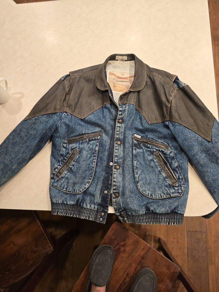 This jacket is a vintage Guess denim and leather jacket from the mid-to-late 1980s, specifically the Georges Marciano era. It features a distinctive two-tone design with blue denim and brown or tan leather panels, which has made it a sought-after collector's item, famously associated with the jacket worn by Marty McFly in Back to the Future.