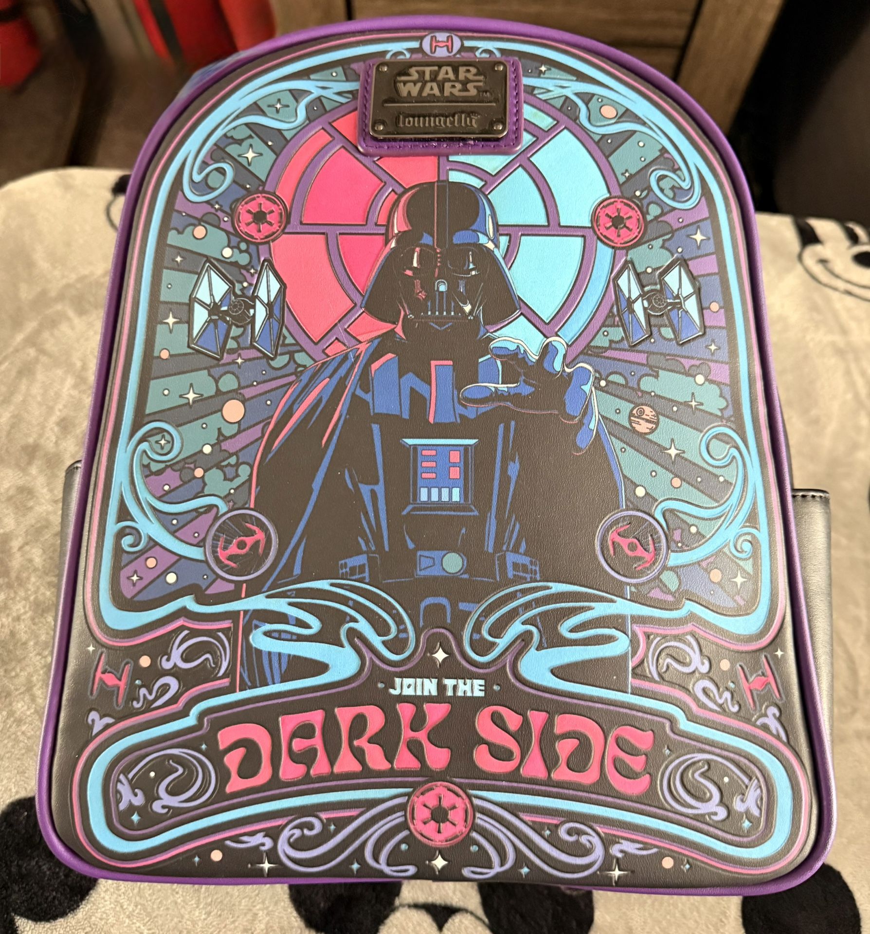 Bring some color to your Dark Side style with this Star Wars-inspired mini backpack! Featuring a portrait of Darth Vader surrounded by embossed TIE Fighters, glow-in-the-dark details, and "Join the Dark Side" lettering on the front, the back includes a design of a lightsaber hilt. With side pockets, a top handle, and adjustable straps, this bag is perfect for your next trip across the galaxy. Approx. 9 1/4" W x 11" H x 4 3/4" D ***brand new never used***