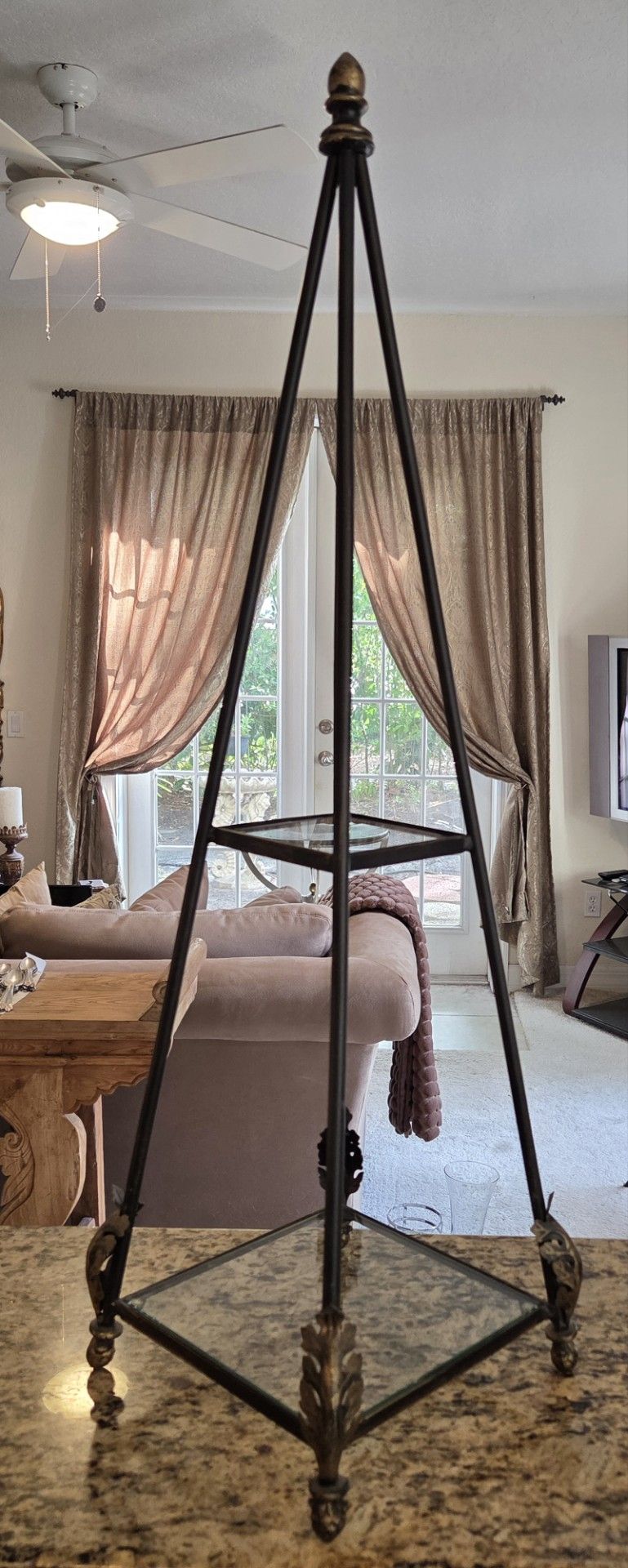 Vintage metal étagère featuring 2 square glass shelves, ornate decorative scrollwork on feet and decorative finial on top. Height: 35" Width: 10" Bottom Shelf: 8 1/4" x 8 1/4" Upper Shelf: 4 3/4" x 4 3/4" Good vintage condition. Displays well, as depicted.