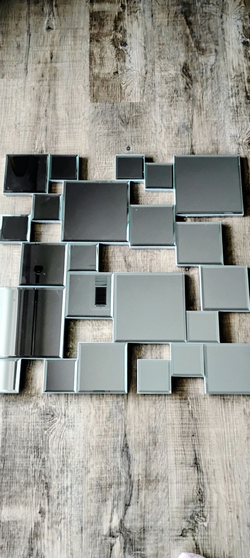 This is a priceless piece from the 70's that is timeless. Beautiful & perfectly placed, beveled mirror pieces, stacked together. What a statement this makes in a home as an entrance piece, over a side table or bar! Two (2) hinges on the back for easy placement. 23"x 23"