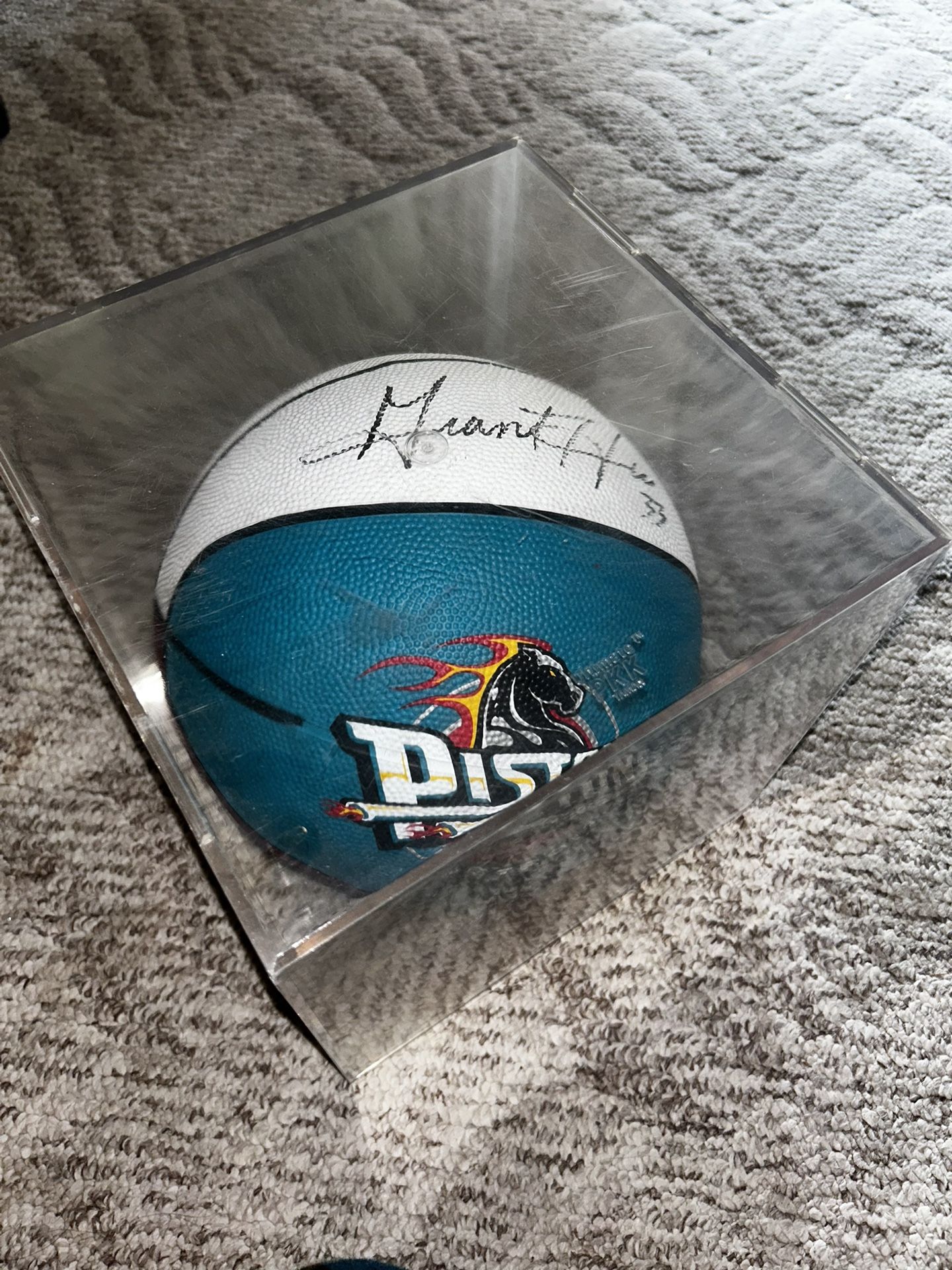 Signed by Detroit Pistons’ Grant Hill #33 NBA player in 1(contact info removed) era; Two tone ball design reflecting the teams’ colors in that time! This is my boyfriends he got it way back when & it is still in GREAT condition. He wanted me to post it here for him to find it a more suitable home. Rich vibrant colors, untouched for decades now.. Smells like rubber LOL it needs some air but it sits flush and visually fully aired when encased. Case is included. Case is 10 ‘’ x 9.5 ‘’ price is negotiable… pick up only NE portland off 148th 97230 cash or cashapp upon pickup preferred! $10 pff if you pick up