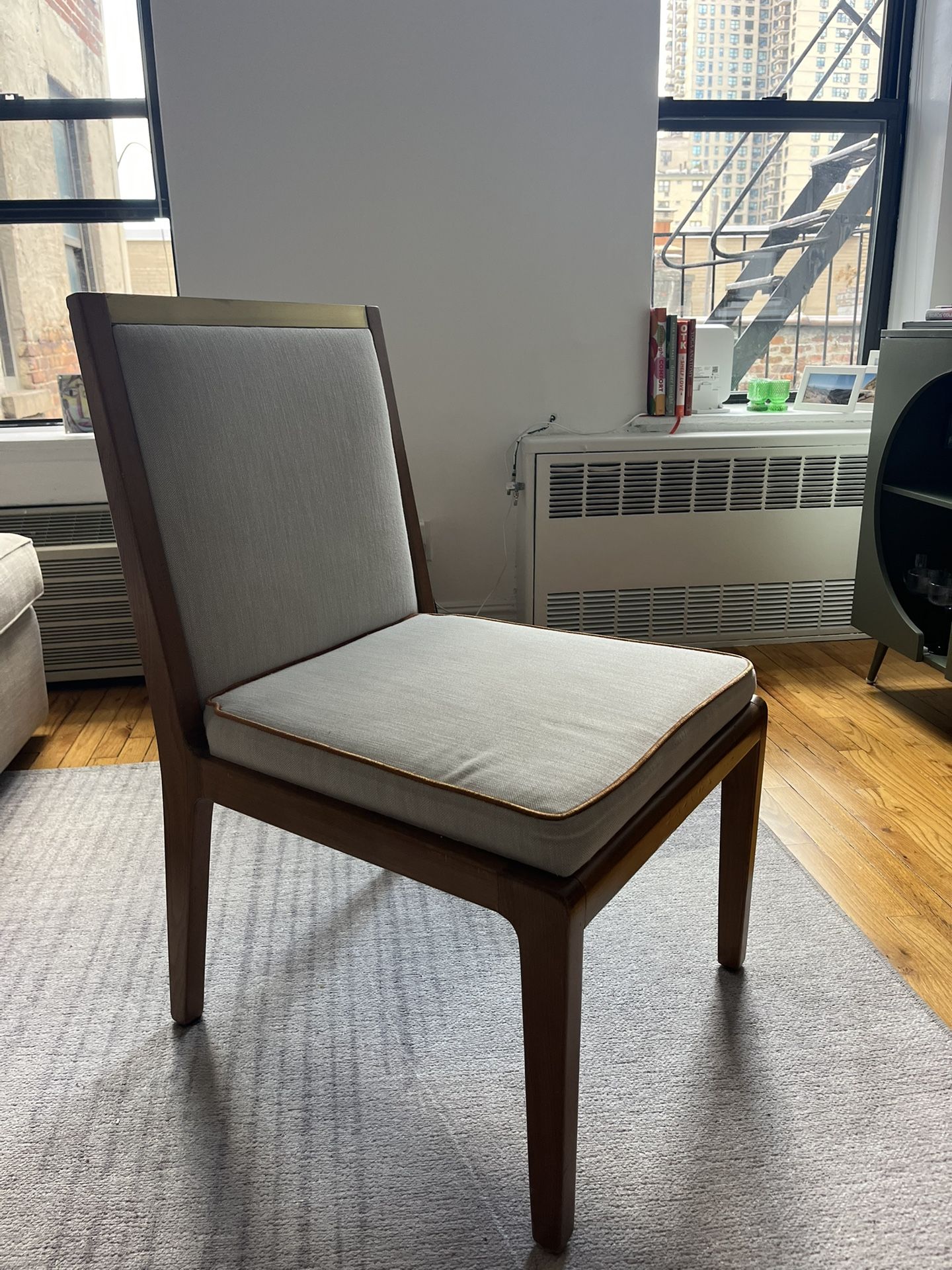 4 white / wooden dining chairs: 35” height and 20” wide Super comfortable - white backing and gold trim at the top of each chair