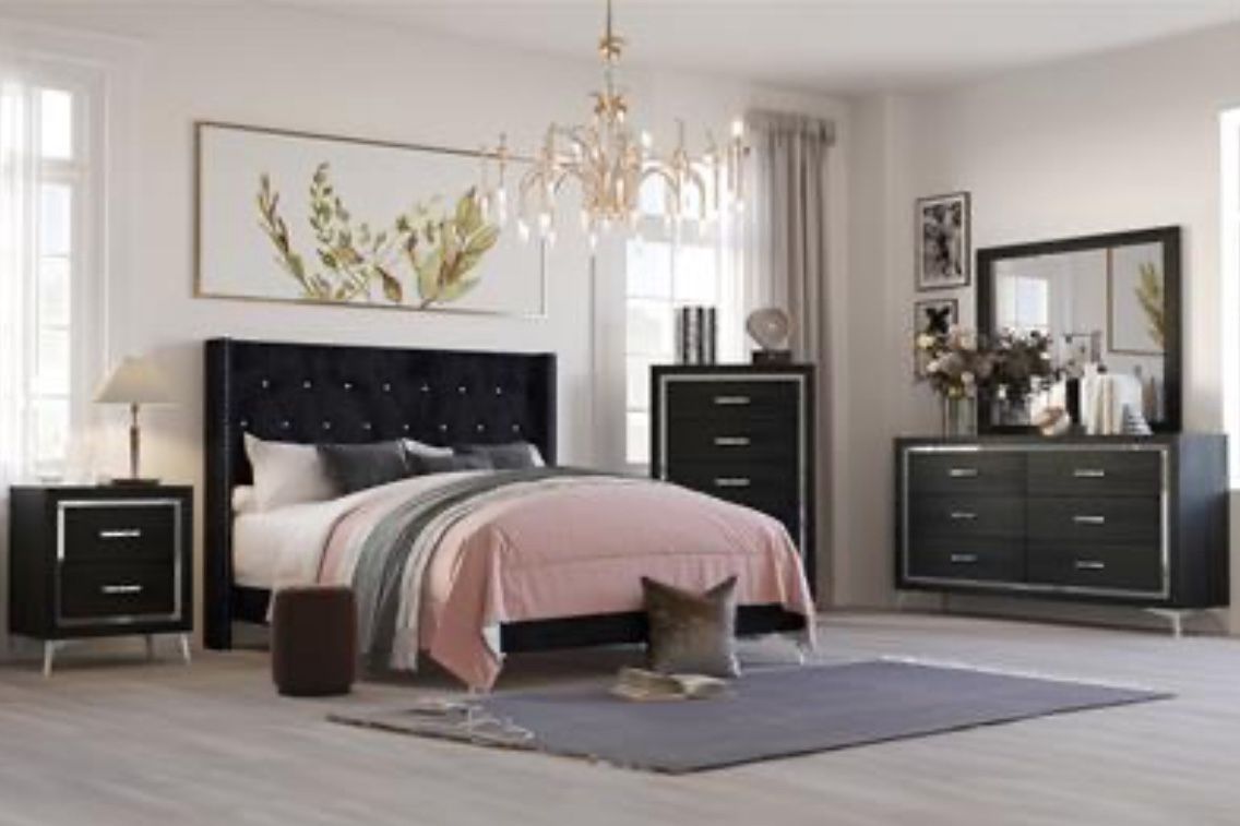 Durable Construction: Carefully crafted of manufactured woods and eco-friendly decorative laminate to create a long-lasting bedroom set.] Contemporary Glam: The Huxley has clean lines enhanced with a crystal button tufted headboard with silver studded trim for a touch of luxury and comfort and metallic accents for a modern touch. Rich Black Finish: This finish provides sleek and sophisticated look that is both timeless and modern. The bold black highlights the metallic accents and smooth surfaces, adding to the overall chic and polished aesthetic. Quality Drawer Construction: Storage drawers roll smoothly on center glides and are constructed with English dovetail joinery for long lasting operation. Functional and Fashionable: The 6-drawer dresser and 5 drawer chest provide ample clothing storage, while the 2-drawer nightstand stores bedside essentials. Chic, crystal studded drawer pulls provide easy access.