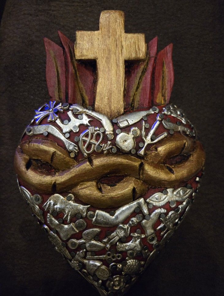 Mexican wood art adorned with Milagros, 7" wall accent.