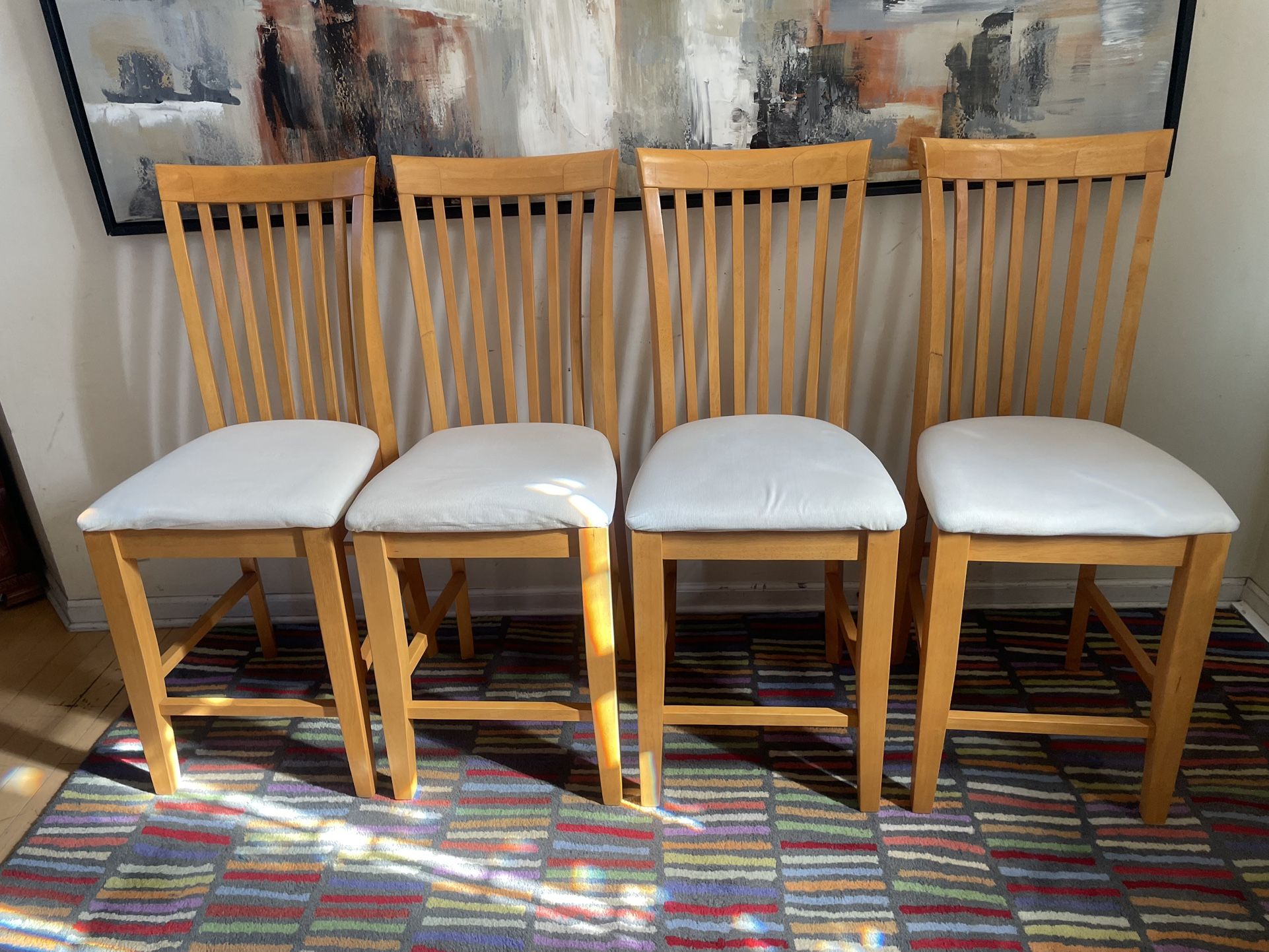 4 Maple Finish and Beige Upholstered Counter Height Chairs Measures Height-42.5” Height from seat to floor- 23” Width-17” Used, in good condition